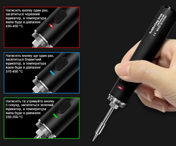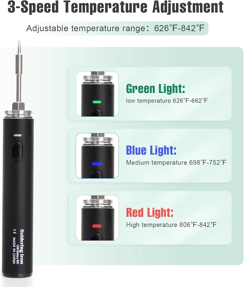 قابلیت تنظیم دما: هویه قابل شارژ را میتوان در سه سطح دما تنظیم کرد، سبز برای دمای پایین (626-662)، آبی برای دمای متوسط (698-752)، قرمز برای دمای بالا (806-842).