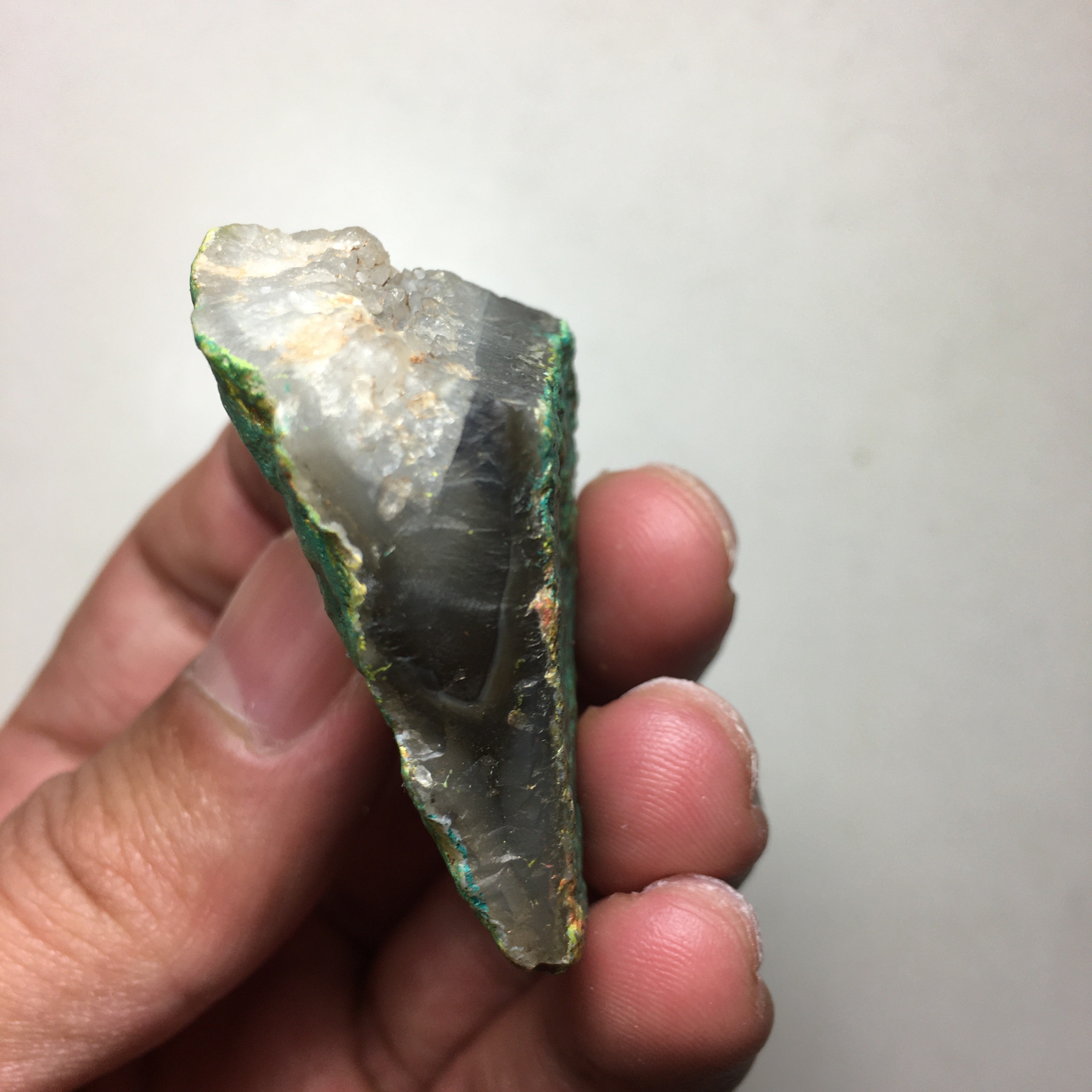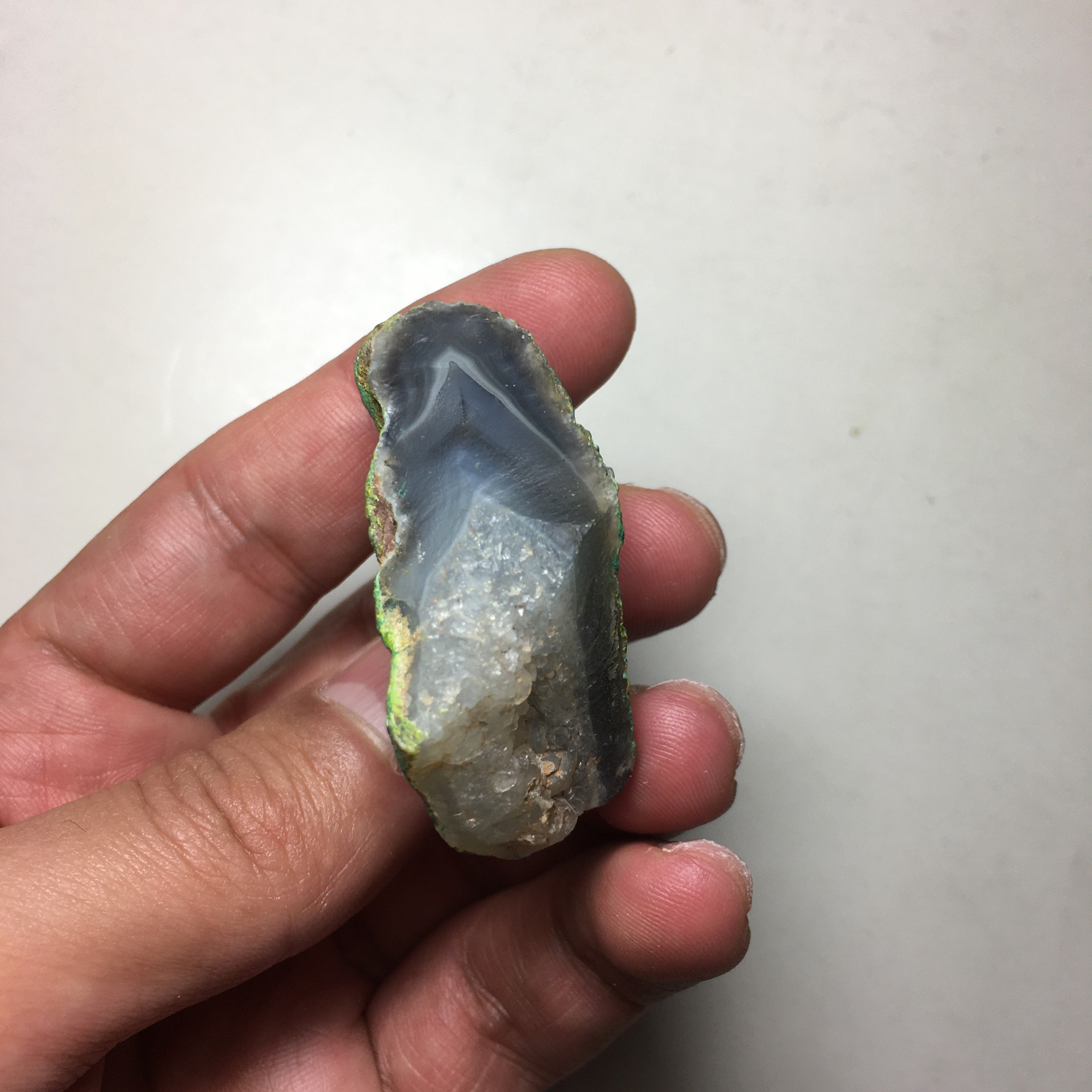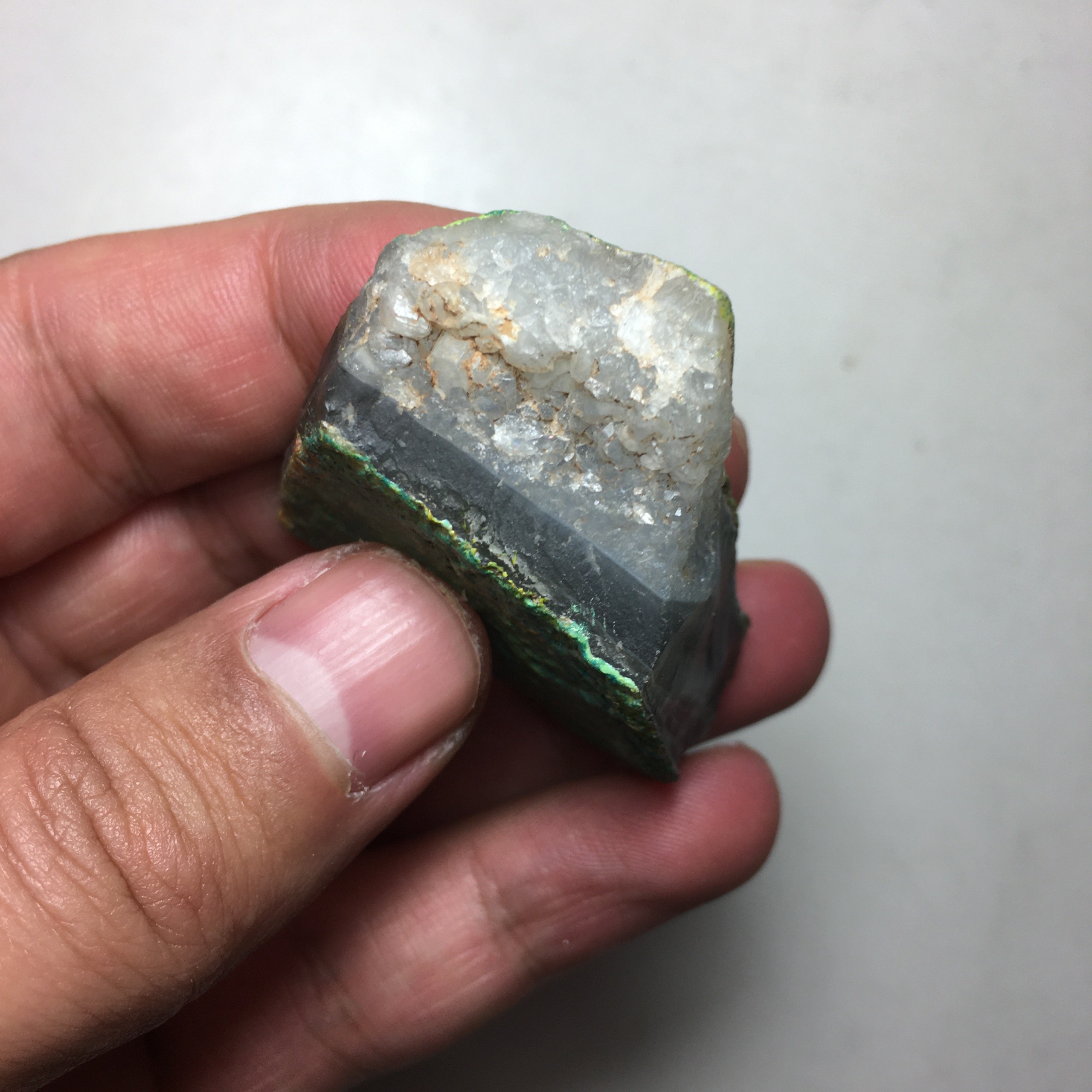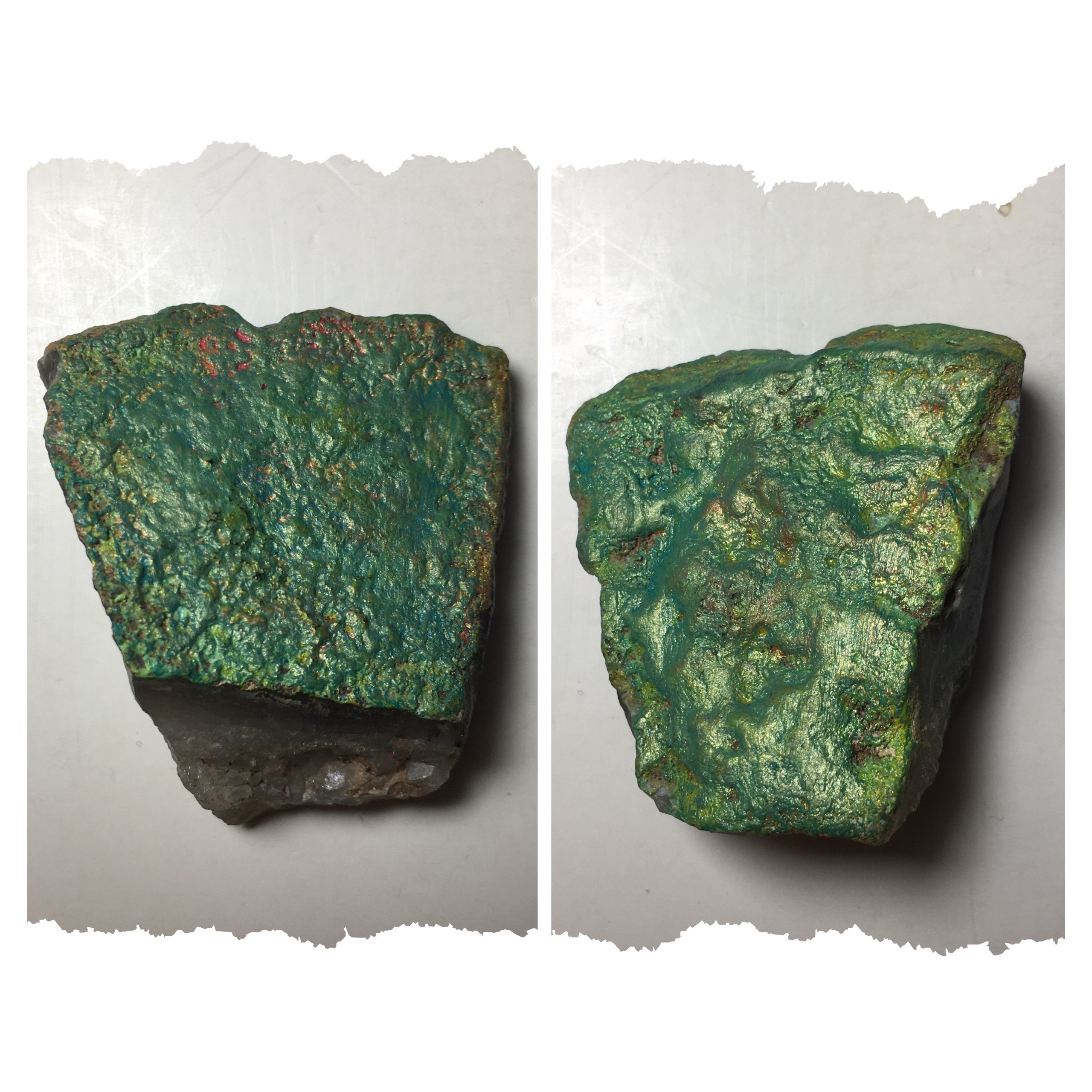 پوسته بیرونی سنگ برای افزایش جلوه و زیبایی، با رنگ اکریلیک سبز پوشانده شده است.