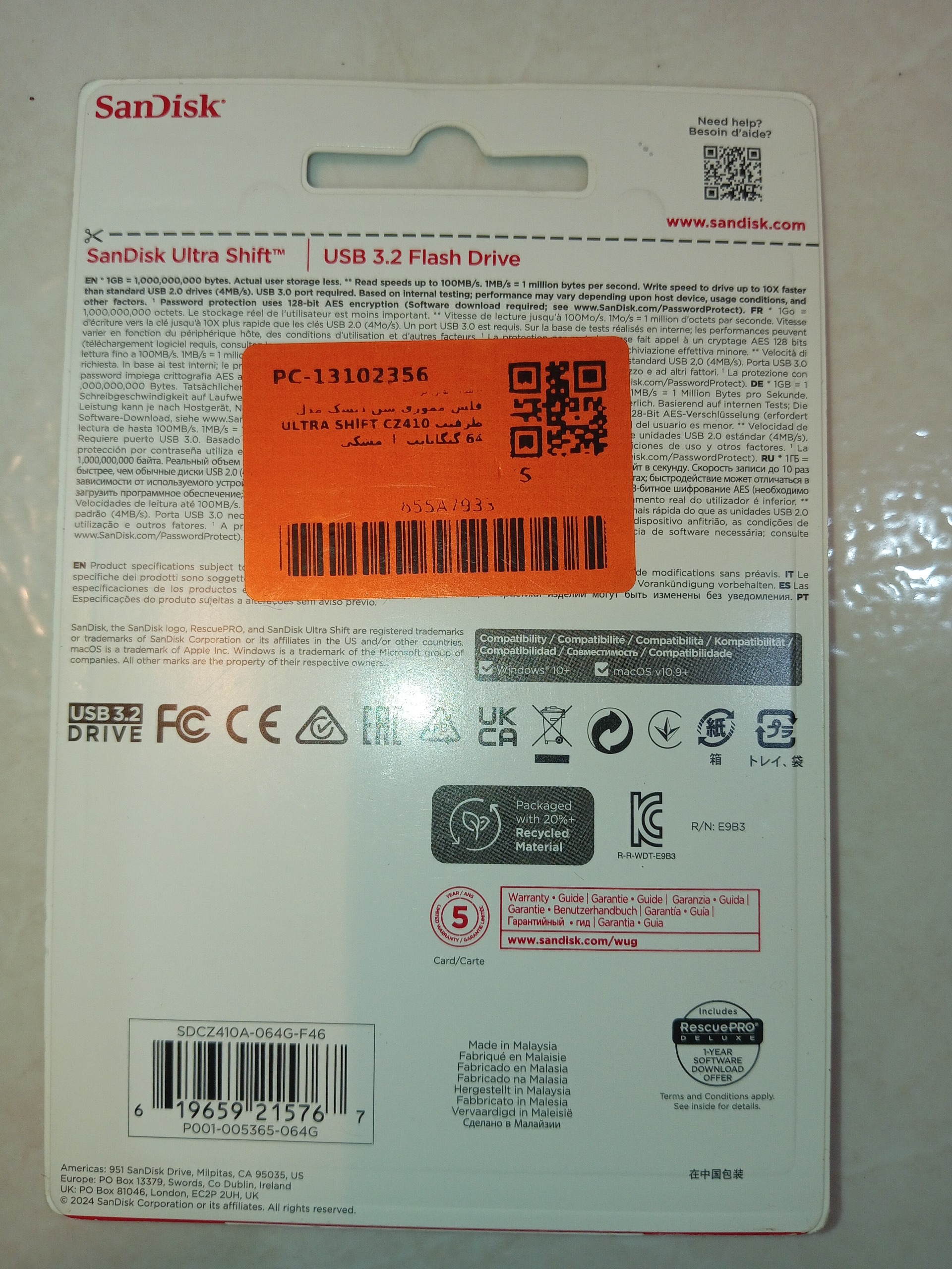 سلام فلش مموری سن دیسک 64گیگ رنگ مشکی دارای گارانتی مادام العمر ماهان رایانه ایران گستر نو و پلمپ می باشد و USB3. 2می باشد ساخت مالزی میتونید از کالاهای دیگر هم دیدن کنید سوالی بود در خدمتم