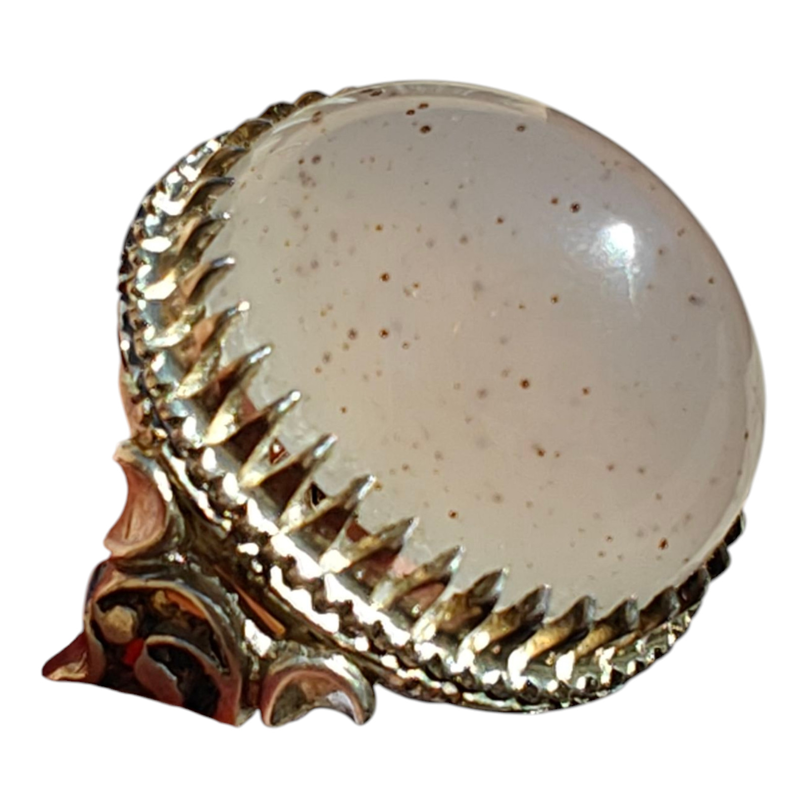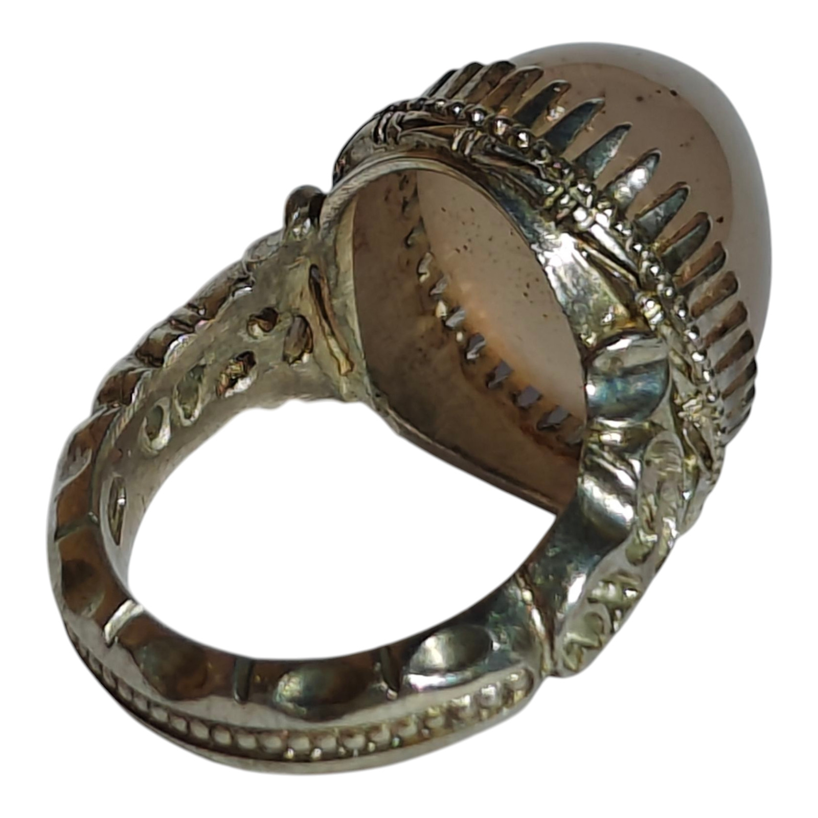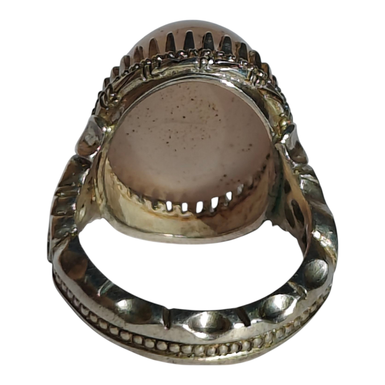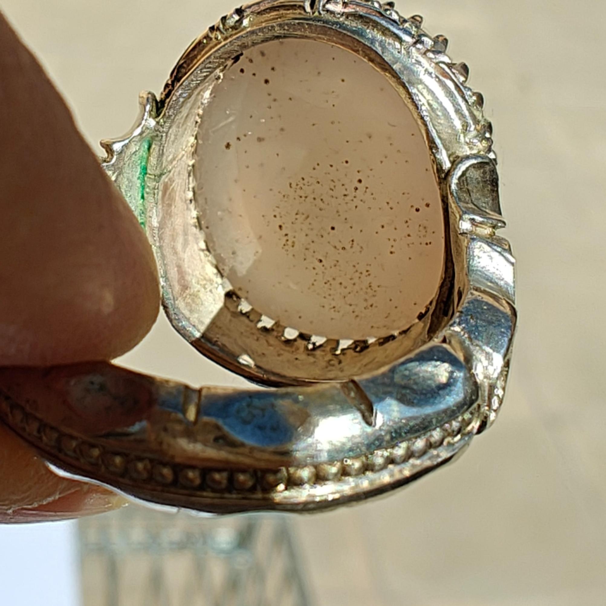 انگشتر عقیق ذغال دار کاملا طبیعی دارای رکاب نقره ی دست ساز می باشد که مهر سازنده بر روی رکاب آن حک شده است.سنگ این این انگشتر آب دار و و دانه های ریز ذغال به زیبایی درون سنگ خود نمایی میکند.