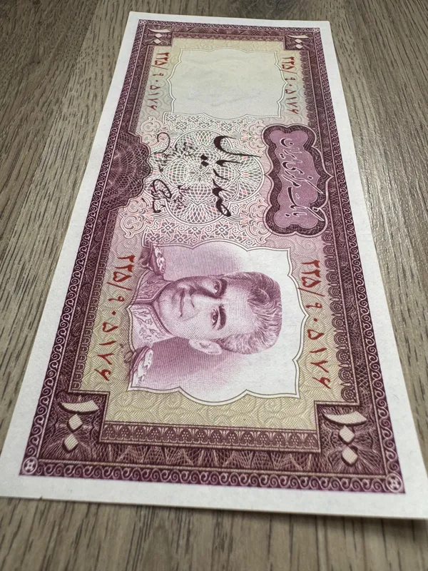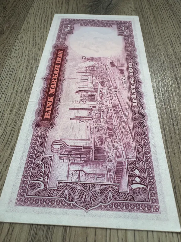 فیلگران نیم رخ محمد رضا پهلوی (ف پهلوی 5) روی اسکناس تصویر محمد رضا پهلوی پشت اسکناس پالایشگاه آبادان
