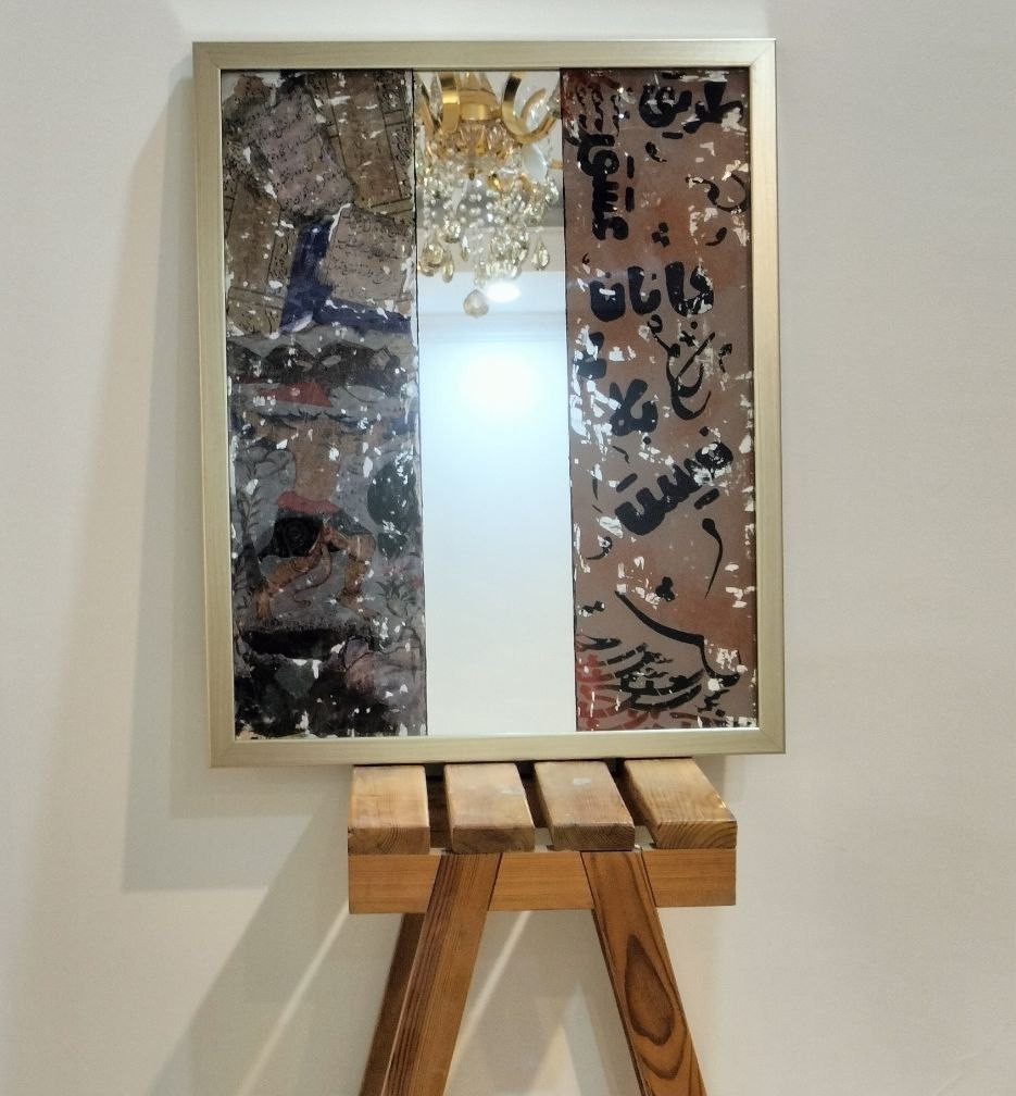 این آینه با ترکیبی از خوشنویسی معاصر، کولاژ تصویری و فضاسازی خلاقانه، روایتی دوگانه از "بازتاب" و "احساس" ارائه میدهد. بخشی از اثر، با واژههایی با ساختار شکسته و خطهایی پرانرژی، لایهای از بیان درونی و شور شاعرانه را ایجاد کرده است؛ در حالی که قسمت دیگر،