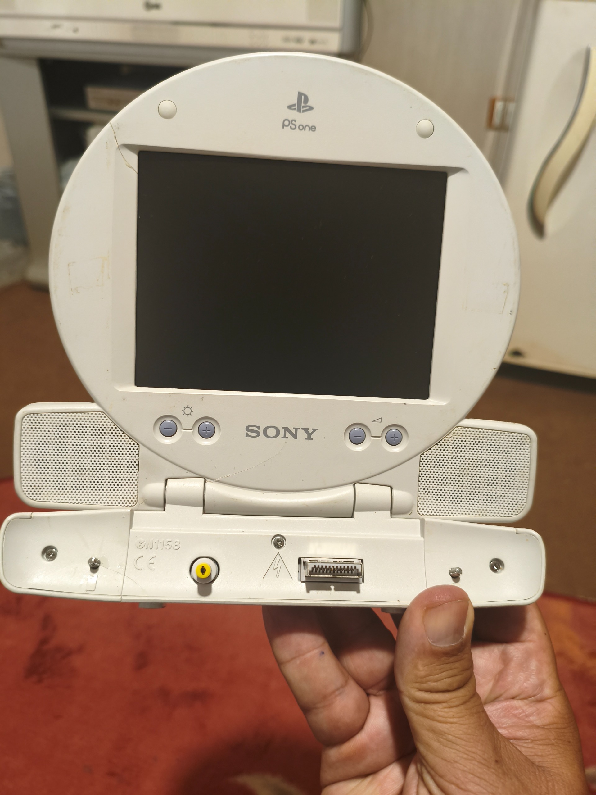 مانیتور پلی استیشن 1 در حد ساخت کره لوازم اضافه نداره فقط یه ترک ریز رو قاب هستش عکس شو گذاشتم که تاثیری رو کارکرد ندارن لولا ها اسپیکر و صفحه نمایش کامل سالم