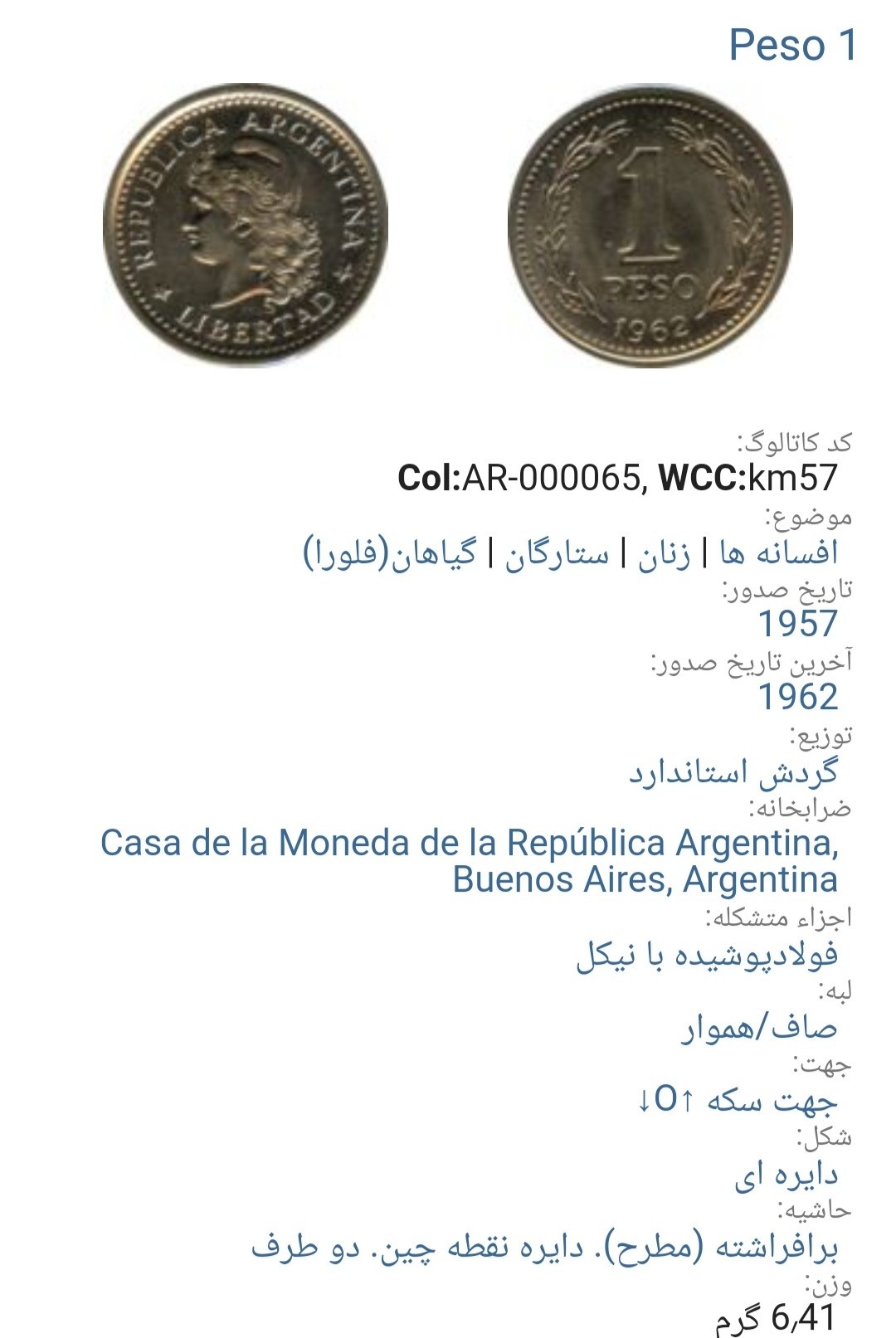 سکه 1پزو آرژانتین1958(کد1066))