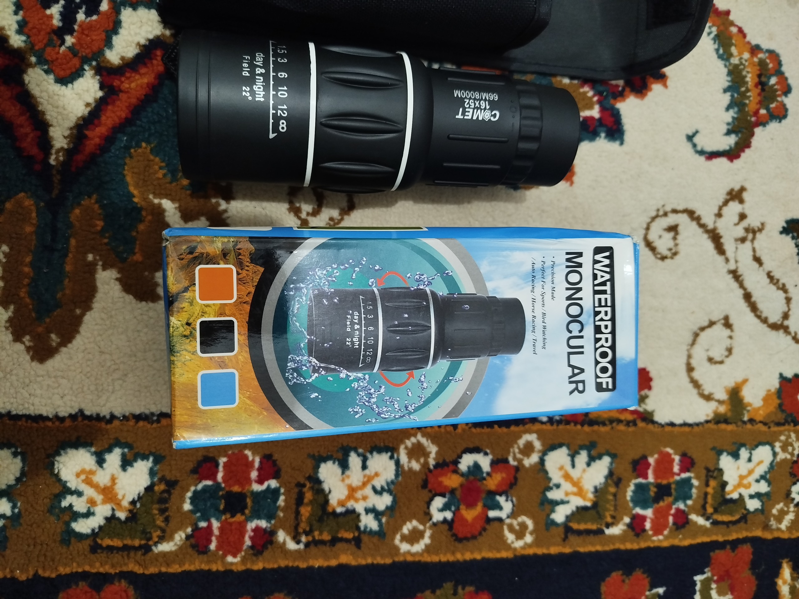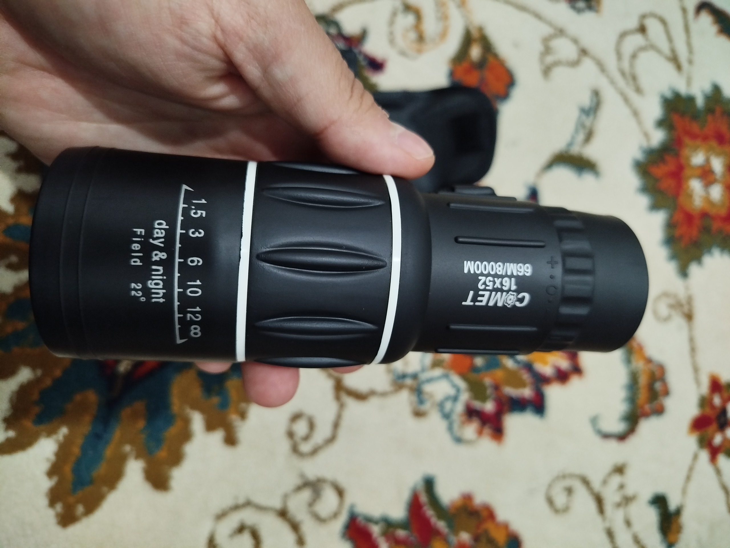 دوربین تک چشمی COMET مدل 16*52 دارای پوشش پلاستیکی محکم و ضد ضربه و ضد آب می باشد. دوربین تک چشمی COMET سیستم فوکوس دوگانه (مرکزی +عدسی کوچک) را دارد که ازین طریق امکان بزرگنمایی تصویر تا 52 برابر را دارد، با این مقدار بزرگنمایی میتوان هر چیزی را در فاصله 8000 متری با دوربین دید که همانند دیدن همان جسم در فاصله 66 متر با چشم غیر مسلح می باشد، همچنین دوربین در نورهای کم، زیاد، آب و هوای بارانی و گرد و غبار کار می کند . گستره قطر دهانه دوربین تک چشمی COMET مدل 16*52 تا 50 میلیمتر، قطر دهانه 40 میلیمتر، قطر مردمک خروجی 55 میلیمتر و فاصله راحتی چشم 10 میلیمتر می باشد. دوربین تک چشمی COMET مدل 16*52 دارای بند آویز و کیف برزنتی کمری می باشد و به همراه آن نیز یک پارچه مخصوص برای تمیز کردن لنزها وجود دارد. از این دوربین میتوان در مسابقات ورزشی ،کوهنوردی ،شکار و دیدن مناظر طبیعی استفاده کرد.