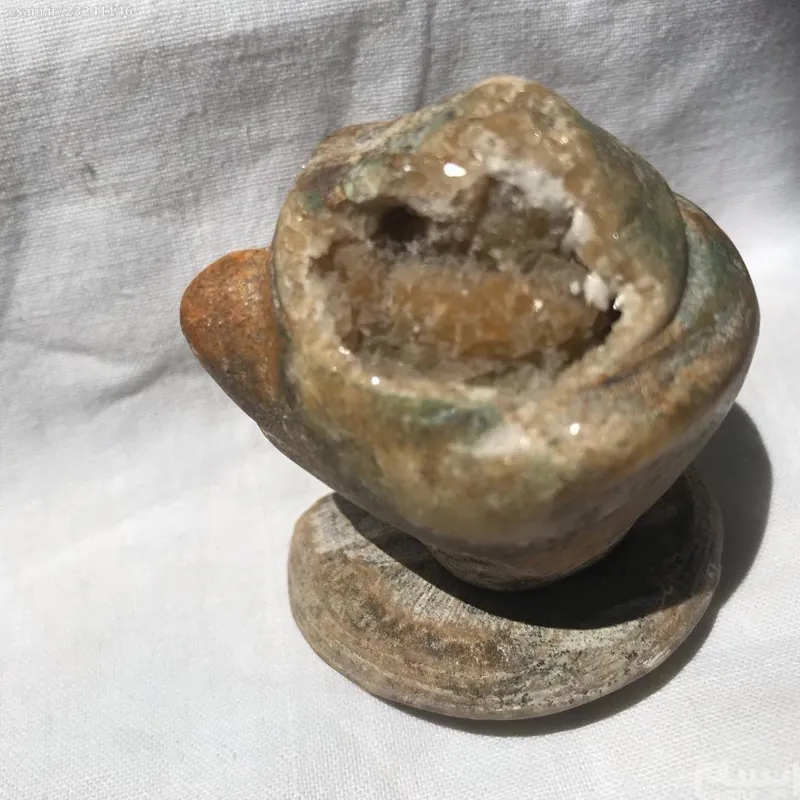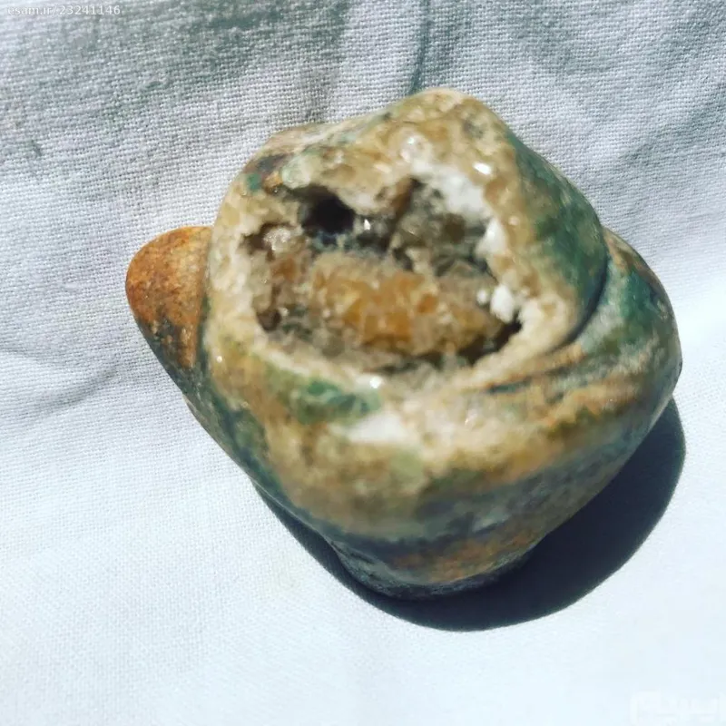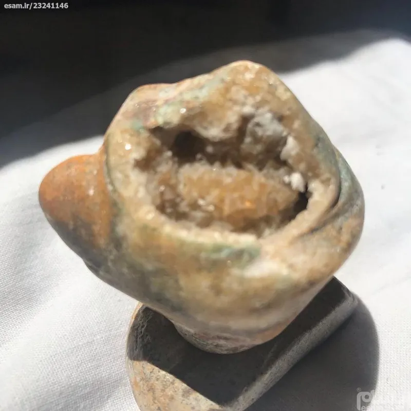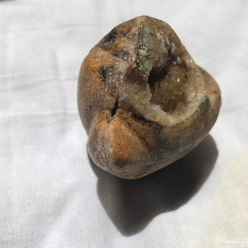 نیمه بالایی گاستروپود فسیل شده منحصر به فردی است که درون آن با کلسدونی جایگزین و با کریستال های طبیعی و ارگانیک دروزی که از سنگهای نیمه قیمتی هستند پوشیده شده است .