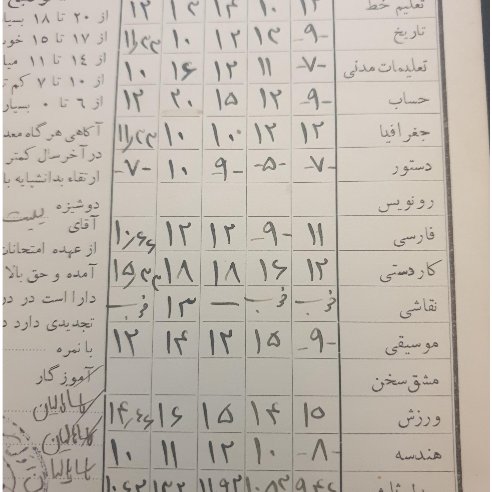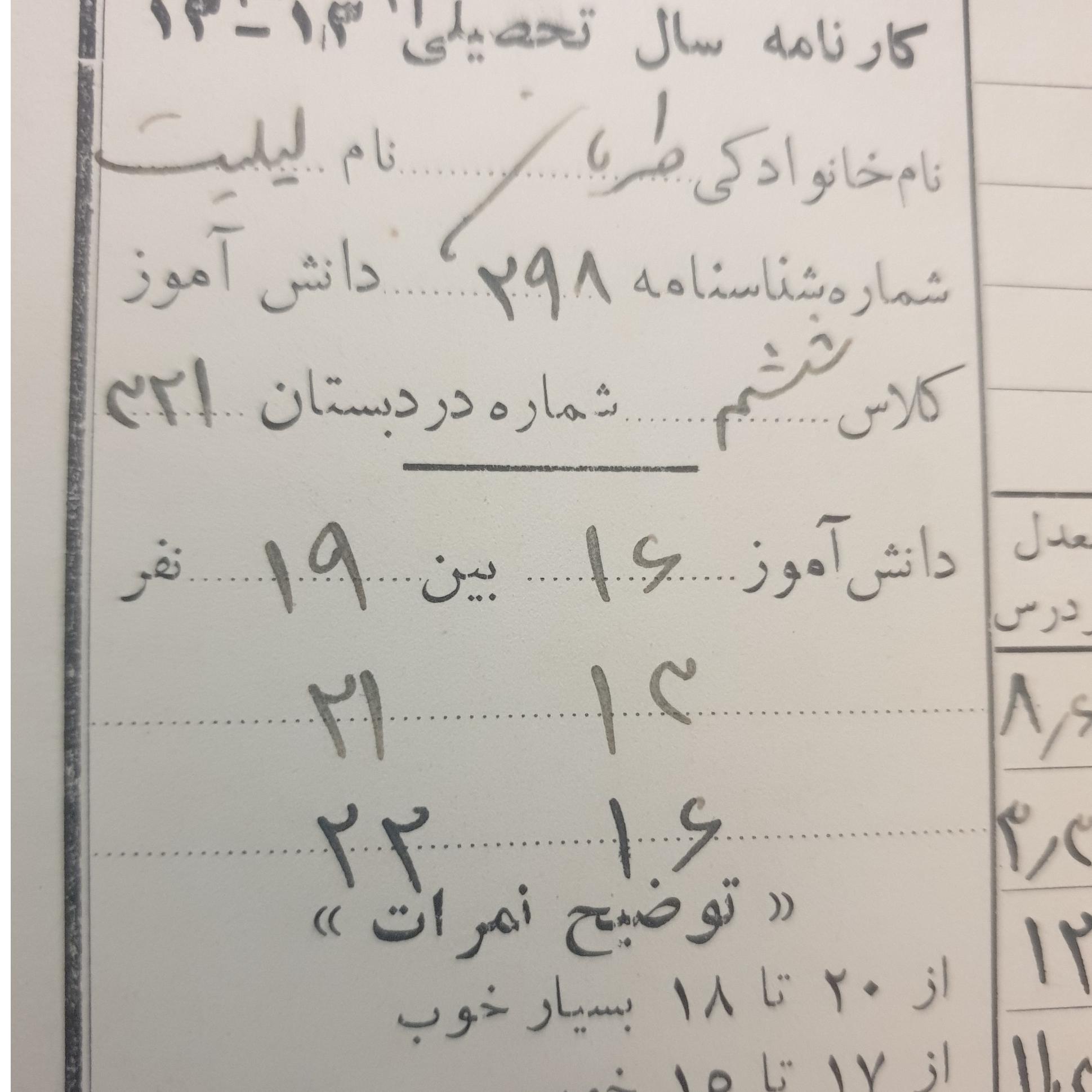 کارنامه کلاس ششم لیلیت طریان 1321 شمسی