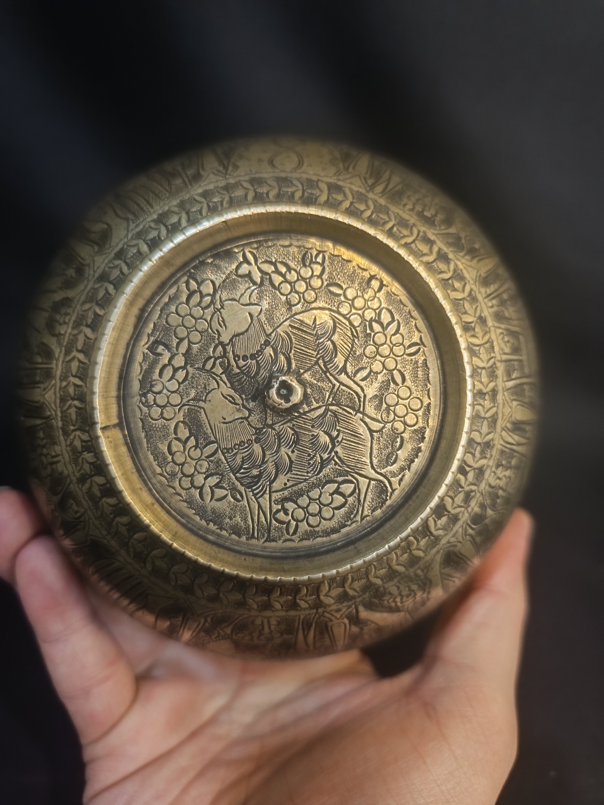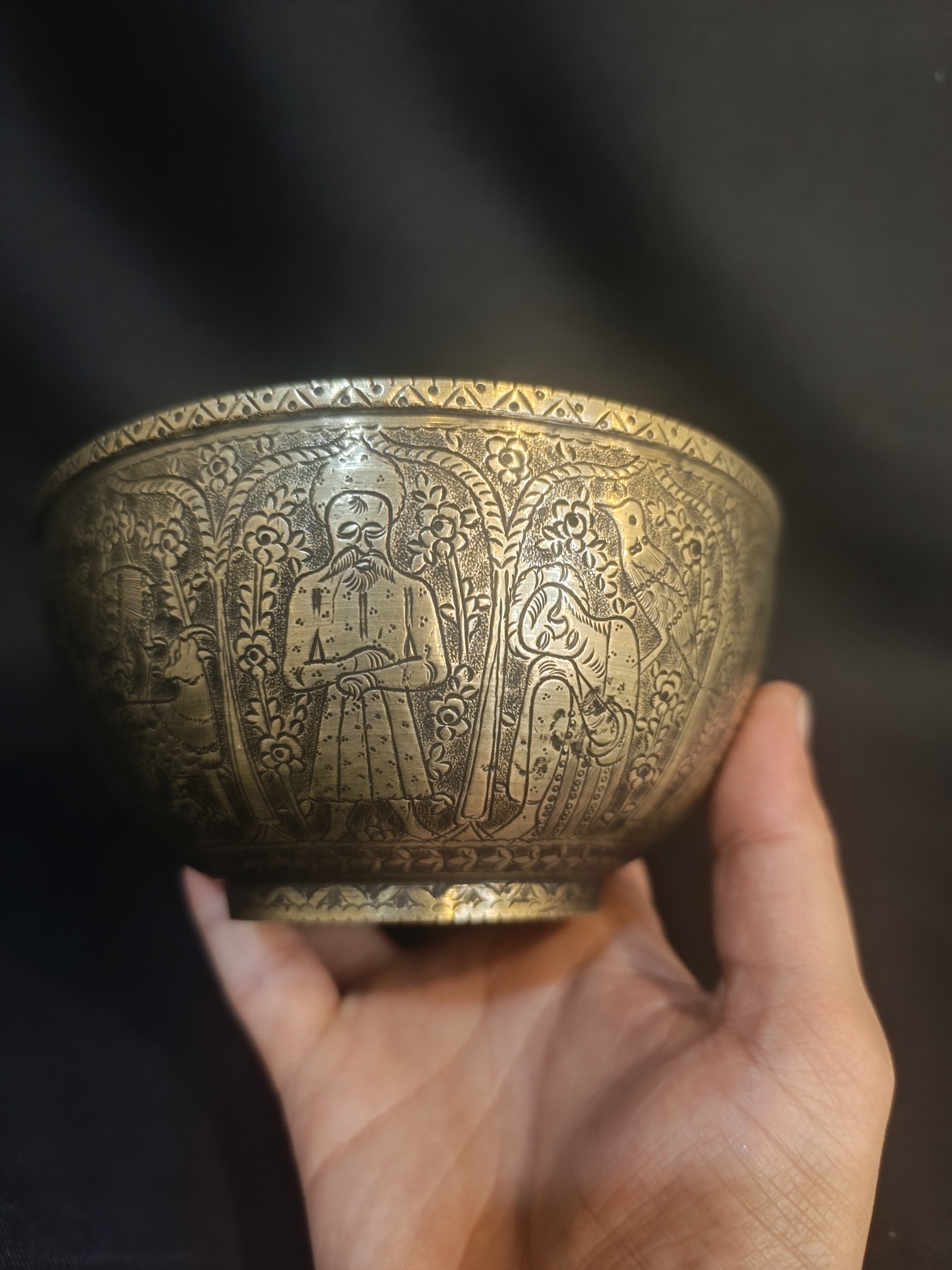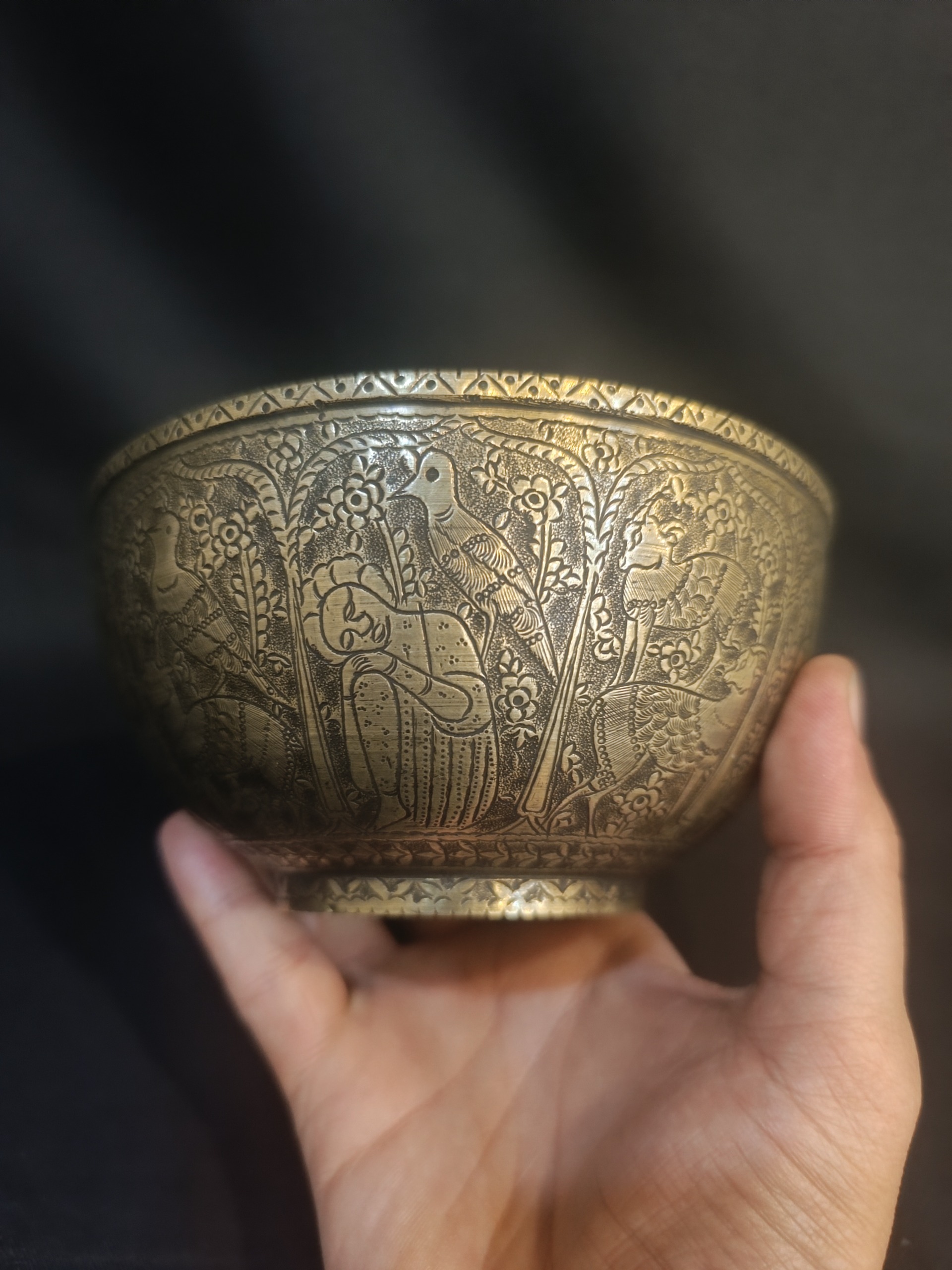 کاسه قلم برزخی فوقالعاده سنگین وزن و جوندار نیم کیلو وزنش هستش قلم کهنه قاجاری تمام ریز قلم حتی کف کاسه توی عکس ها گذاشتم یک کاسه عتیقه و کلسیونی به معنای واقعی قطر دهانه کاسه 14 سانتی متر