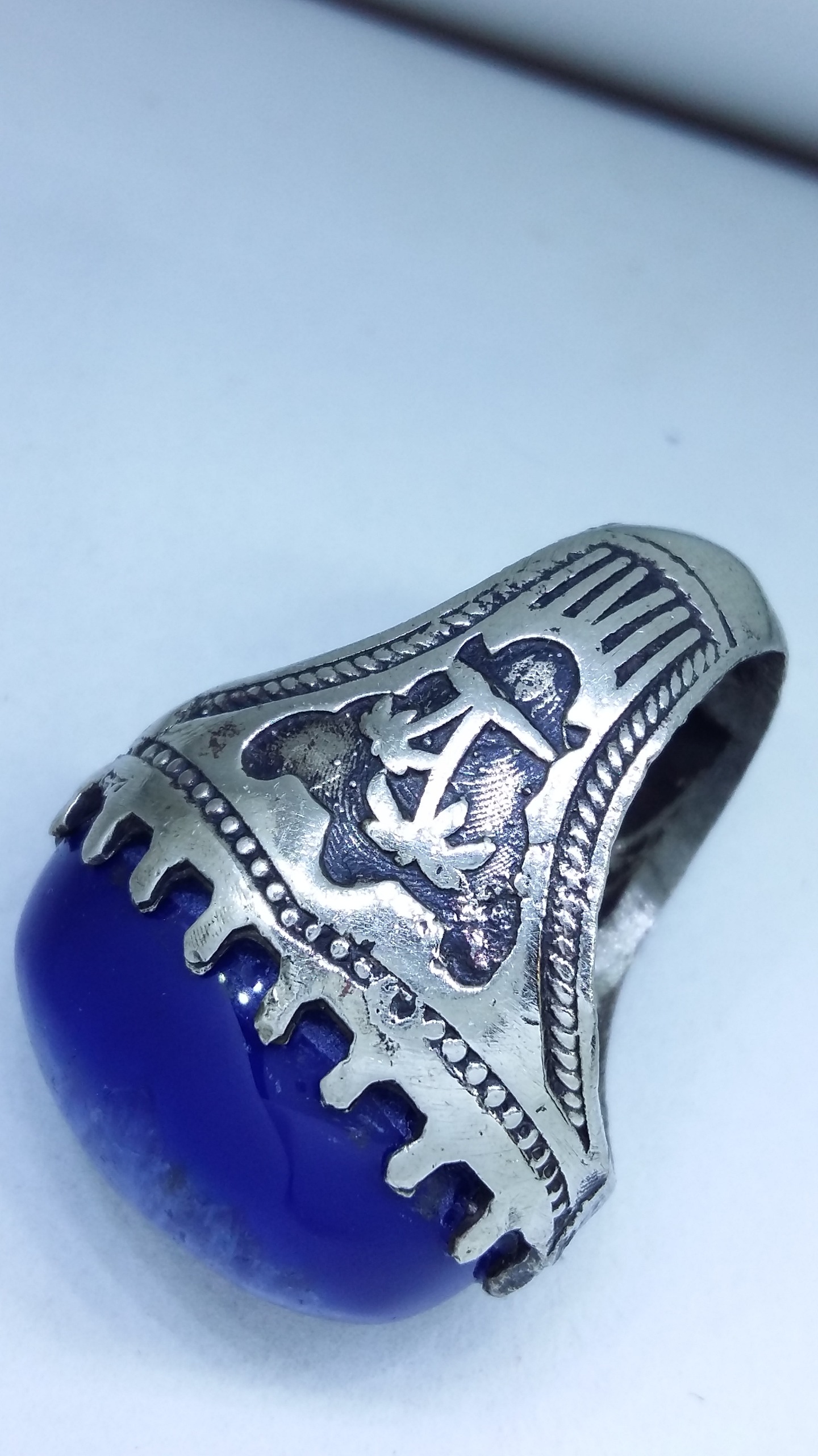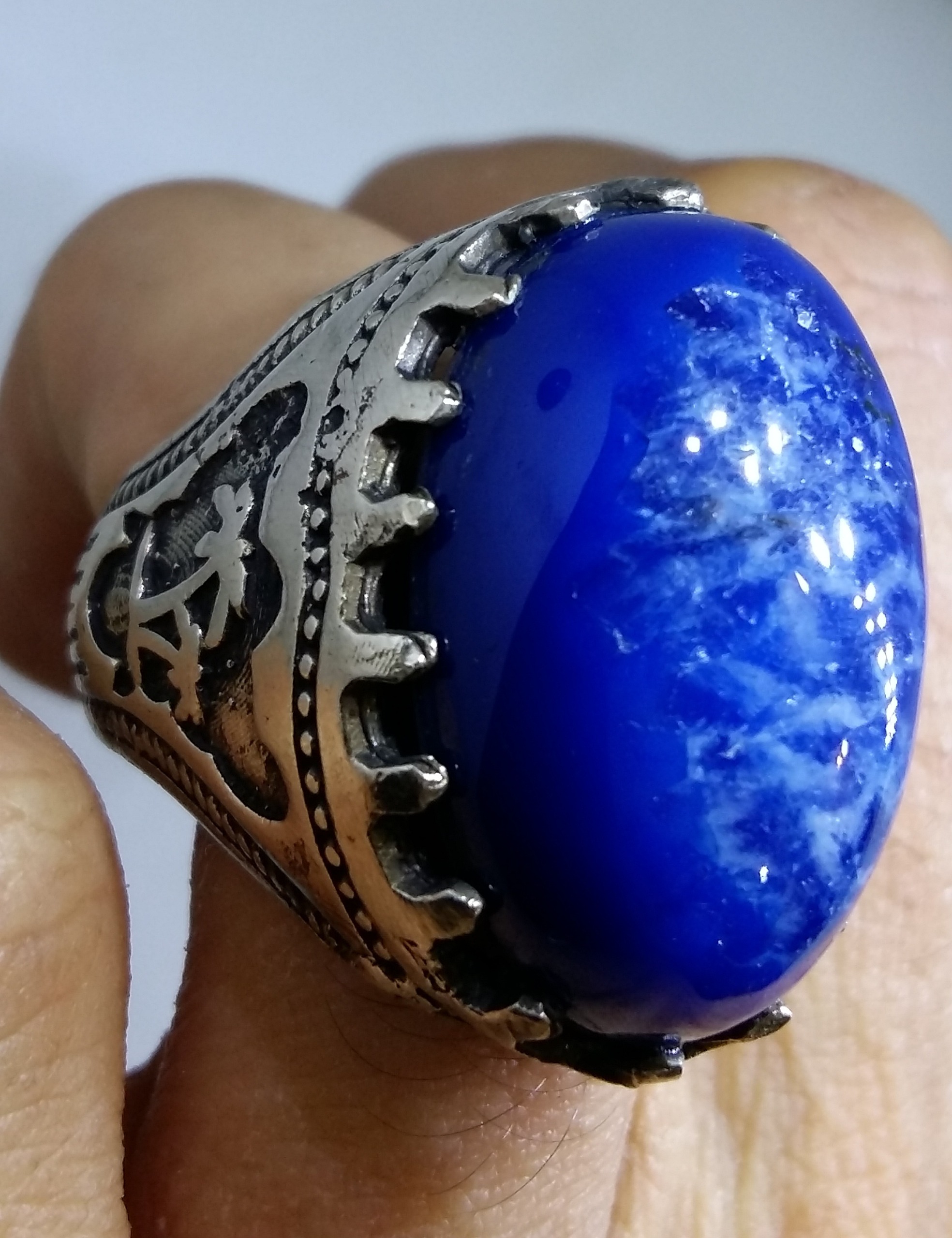 انگشتر قلمزنی نخل عقیق آبی ابر دار خوشرنگ معدنی