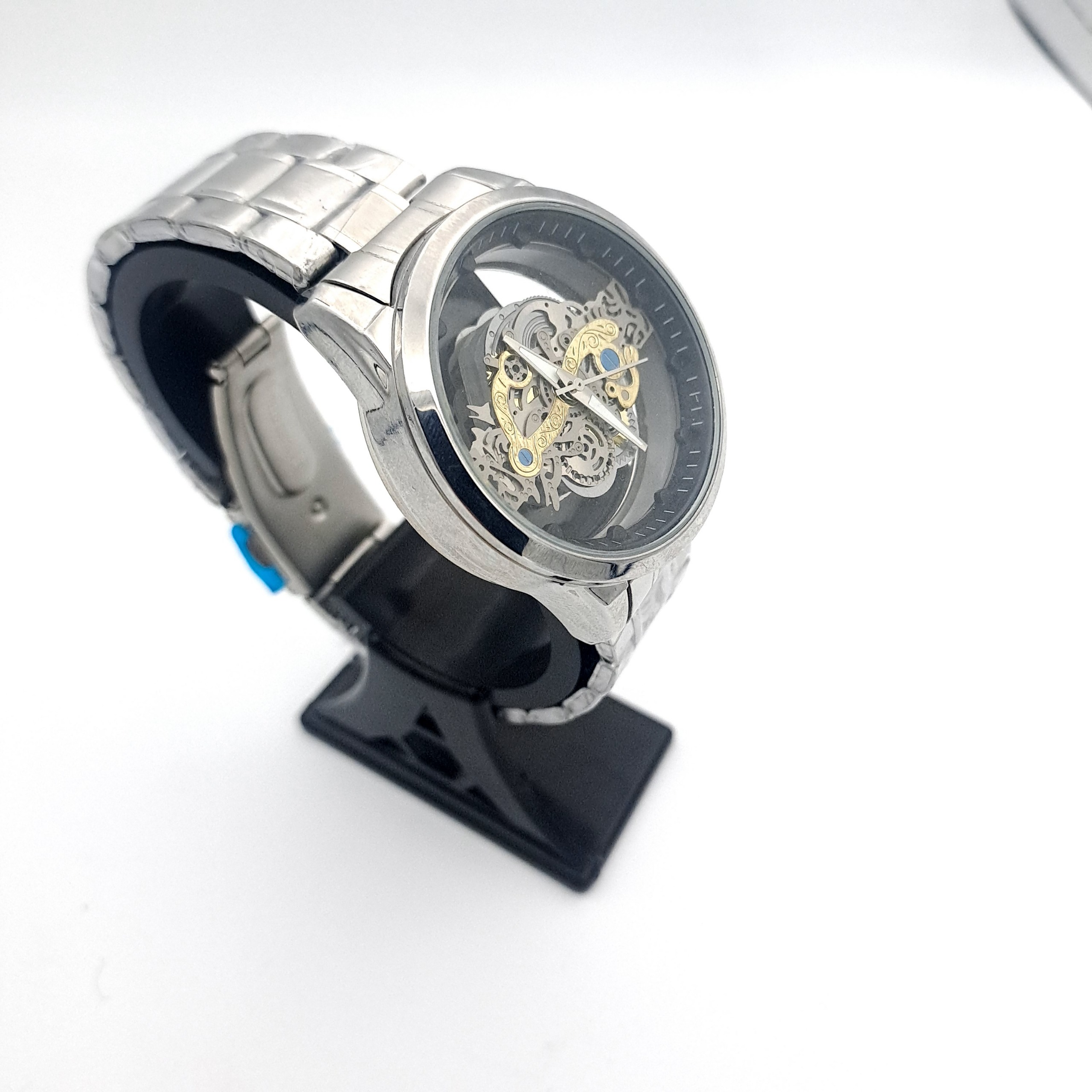 پشت شیشه ای درب پشت ساعت شیشه ای است و متور نمایان طرح اتومات ولی باتری خور است و باتری دارد