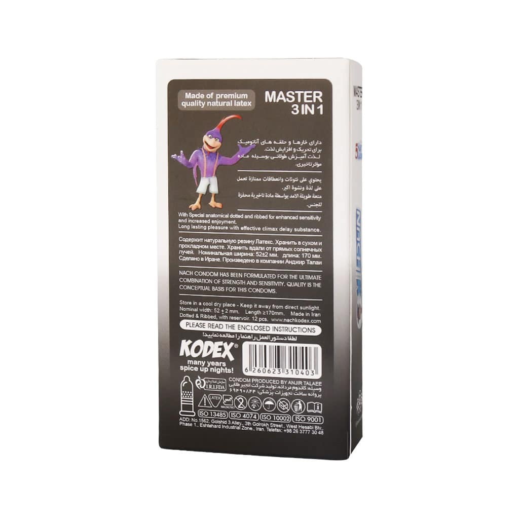 ویژگی های کاندوم خاردار و وقفه دهنده و میوه ای 3 در 1 کدکس NACH KODEX بسته 12 عددی