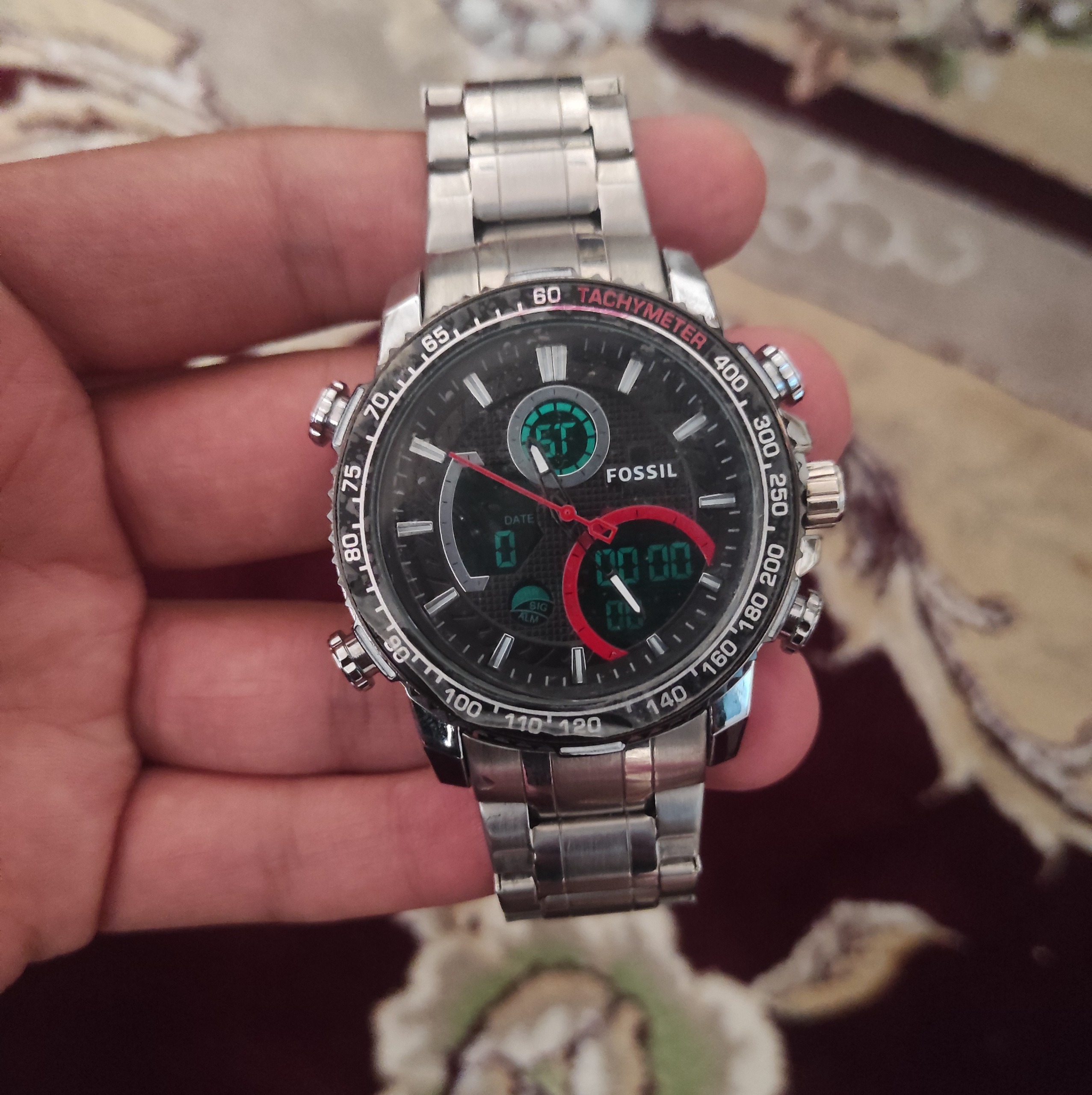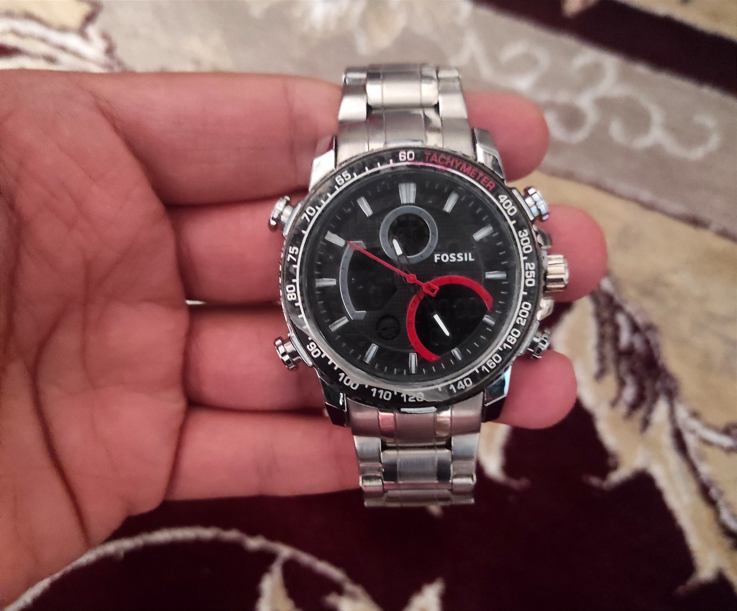 ساعت مچی دو زمانه مردانه از برند Fossil (فسیل ) این مدل ترکیبی از نمایش آنالوگ و دیجیتال دارد (یعنی هم عقربهای است و هم صفحه دیجیتال دارد).