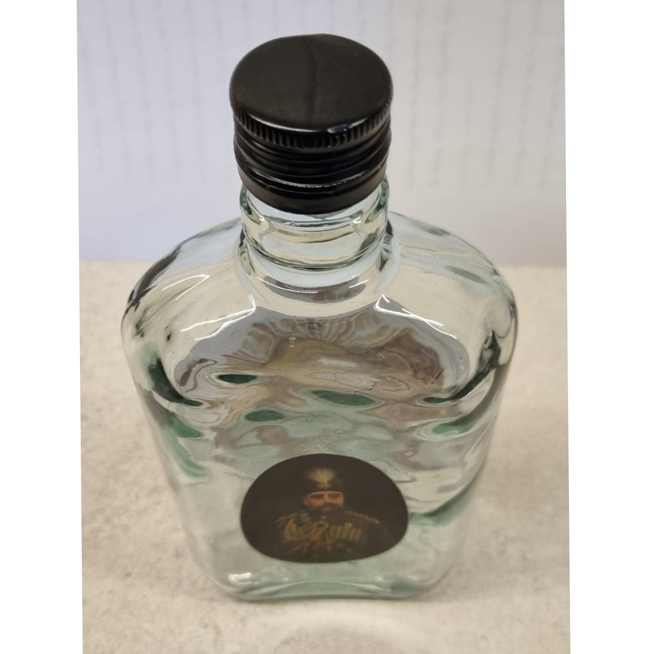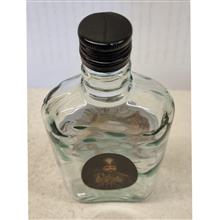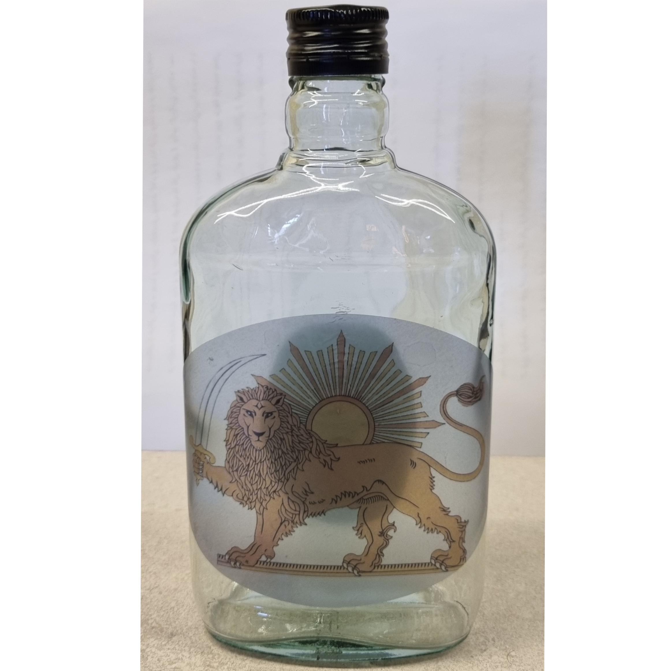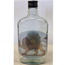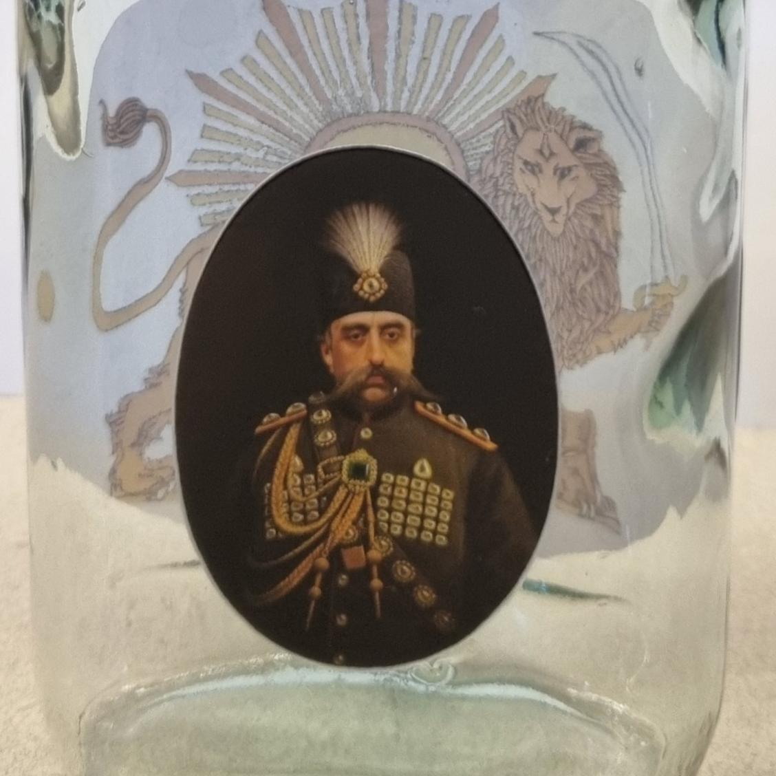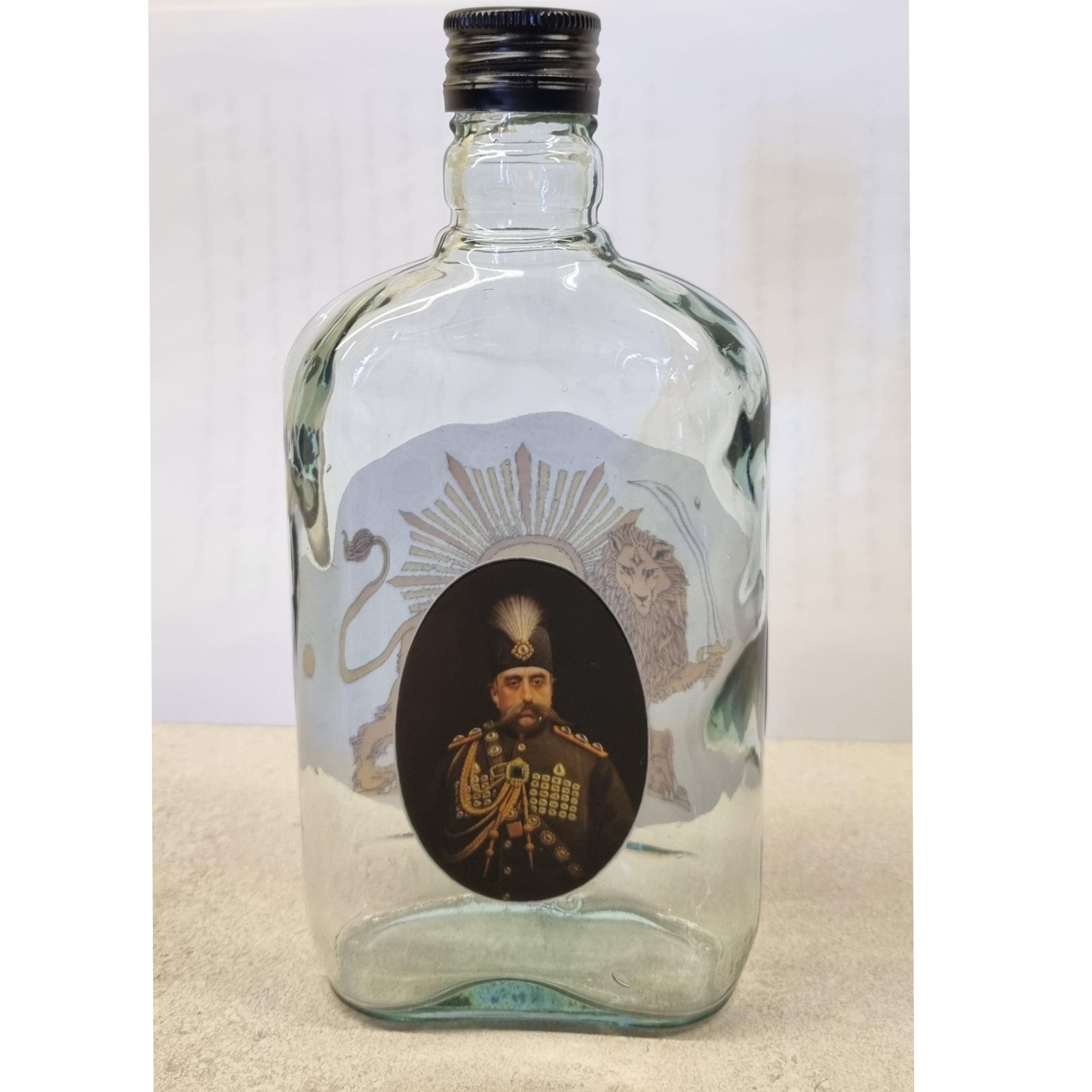 بطری شیشه ای کتابی با لیبل های طرح قاجاری. ابعادی حدودی 20×10 سانتیمتر