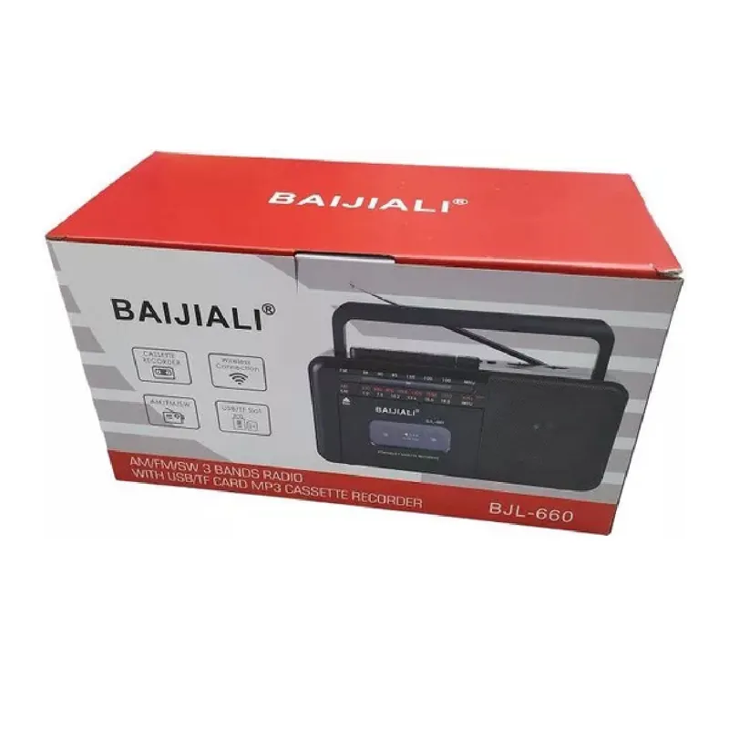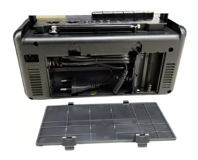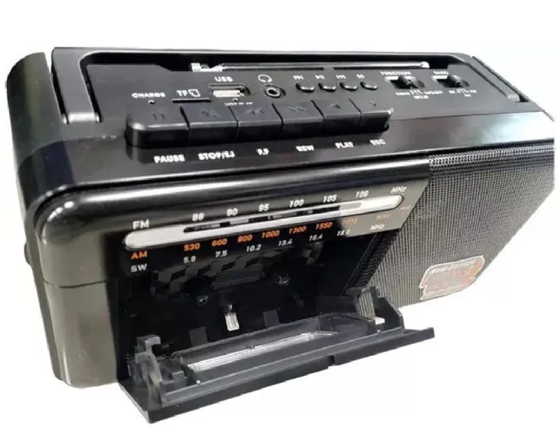 پخشکننده رادیو-کاست بلوتوث، با صدای باکیفیت در طراحی کاربردی و قابل حمل. ویژگیها: فرکانسهای رادیویی: FM/AM/SW، FM: 87.5 108 (64-108) مگاهرتز، پورتهای بلوتوث: کارت TF / USB / AUX، ضبط ضبط. پخش فایلهای MP3 به محض وارد کردن کارت SD/MMC یا فلش مموری USB (حافظه داخلی ندارد)، آنتن تاشو. منبع تغذیه باتری (4 عدد UM1/DX شامل نمیشود) یا منبع تغذیه 220 ولت (منبع تغذیه موجود در محفظه داخلی مخصوص) ابعاد: 22 × 12 سانتیمتر