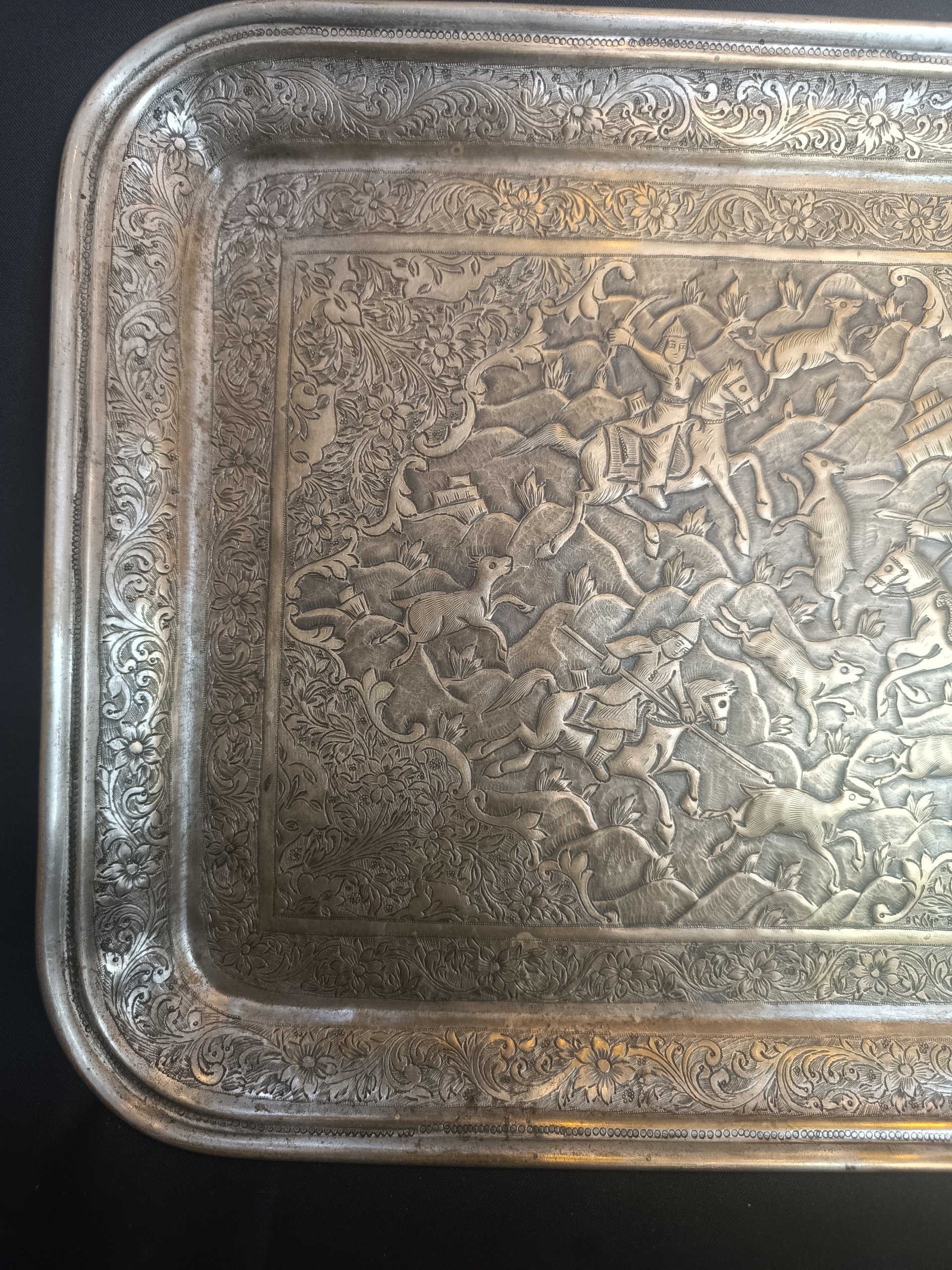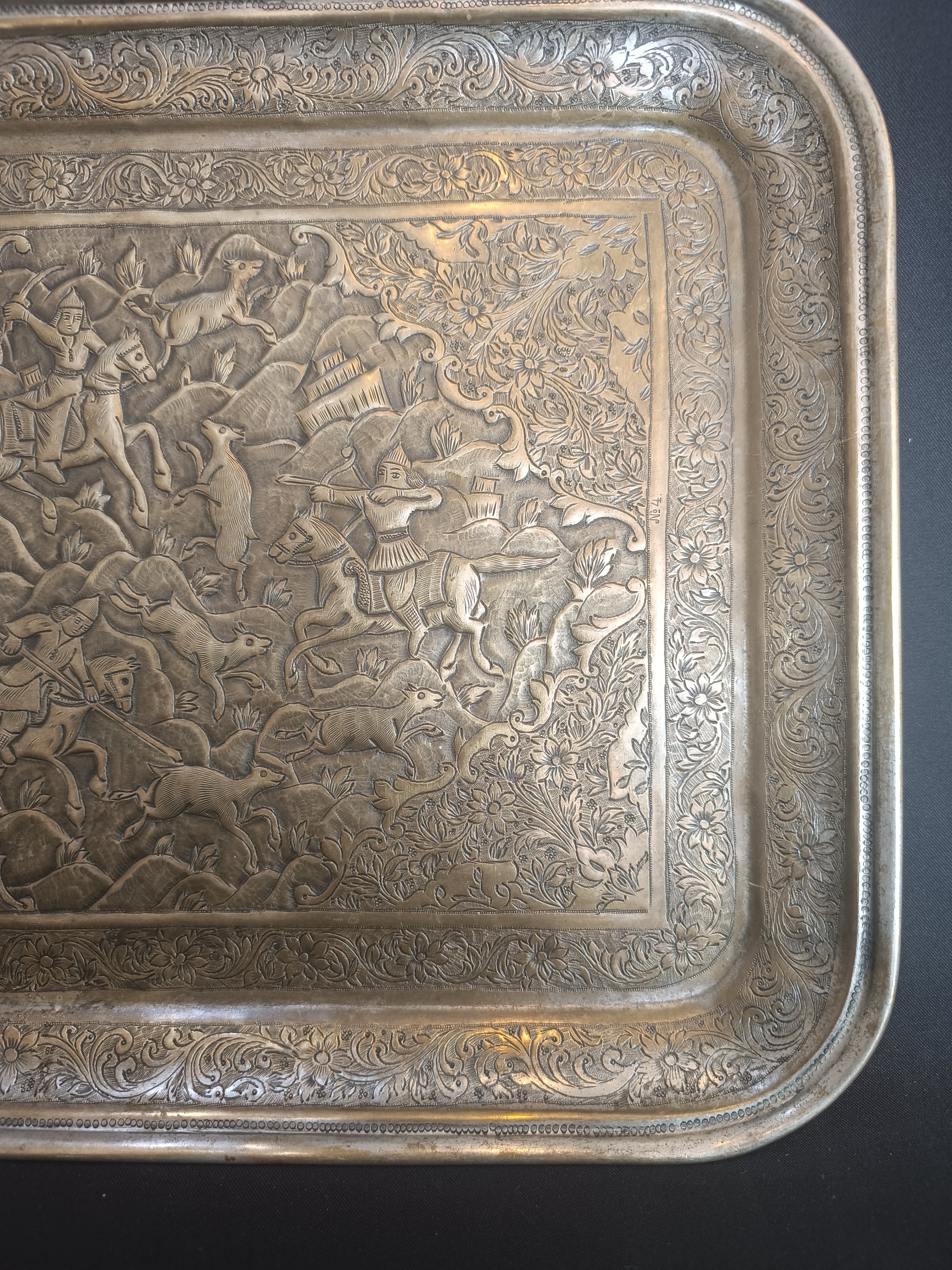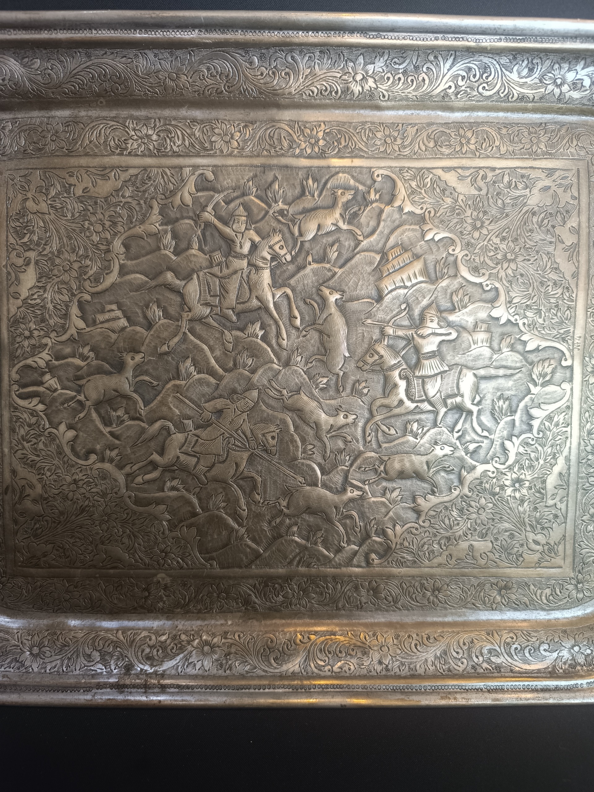 سینی برنجی قلم کهنه شکارگاه فوقالعاده سالم بکر و زیبا قلم زنی بصورت برجسته کار شده به شرط اصالت و کهنه بودن پورتال دور اسلیمی کار شده ابعاد 32 در 40 سانتی متر بدون کوچکترین عیب و ایراد قیمت بی نظیر