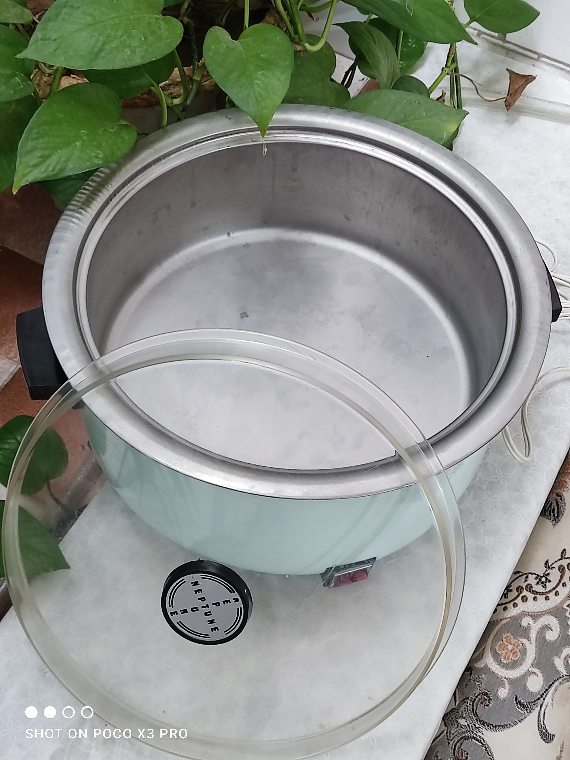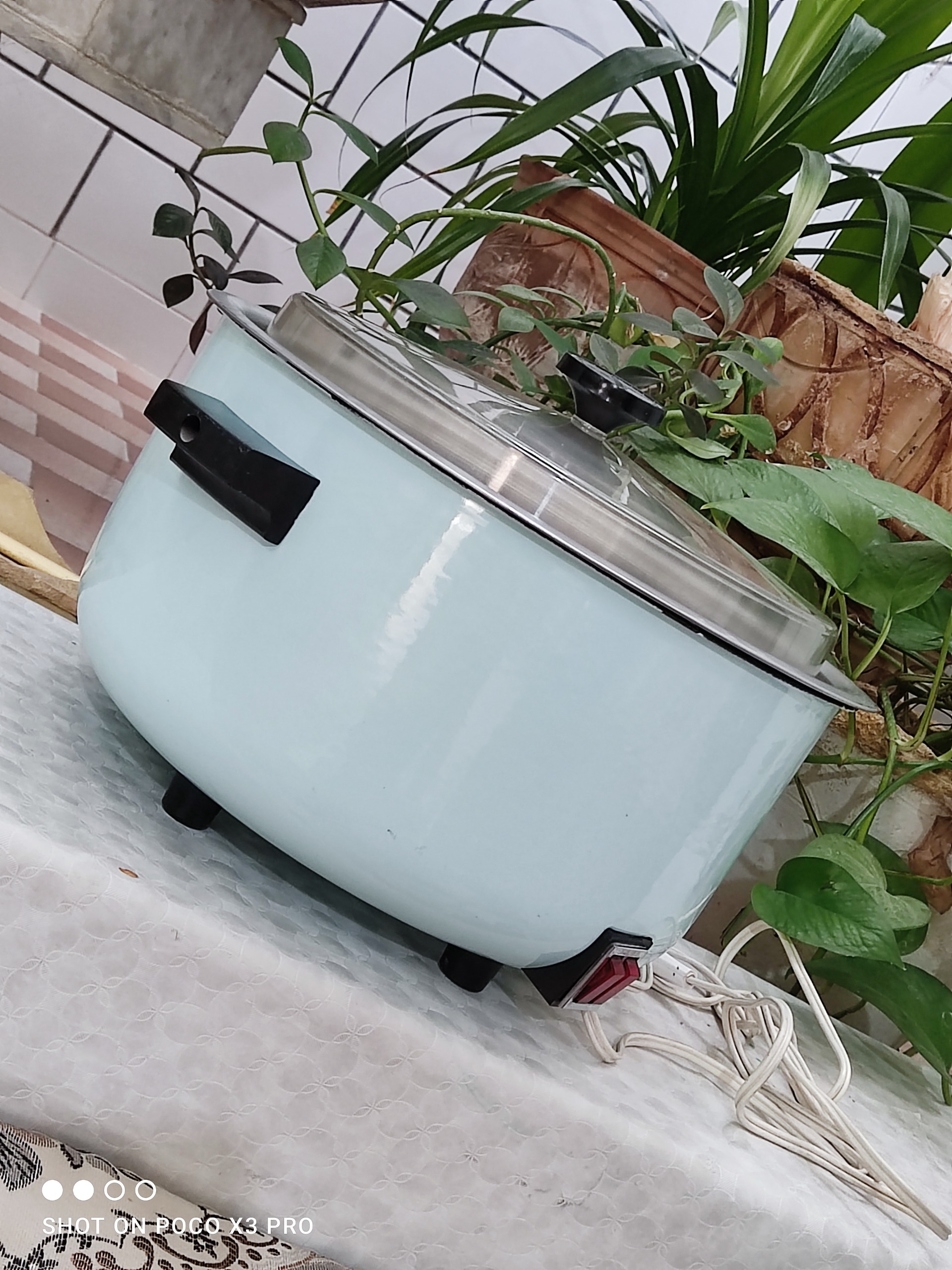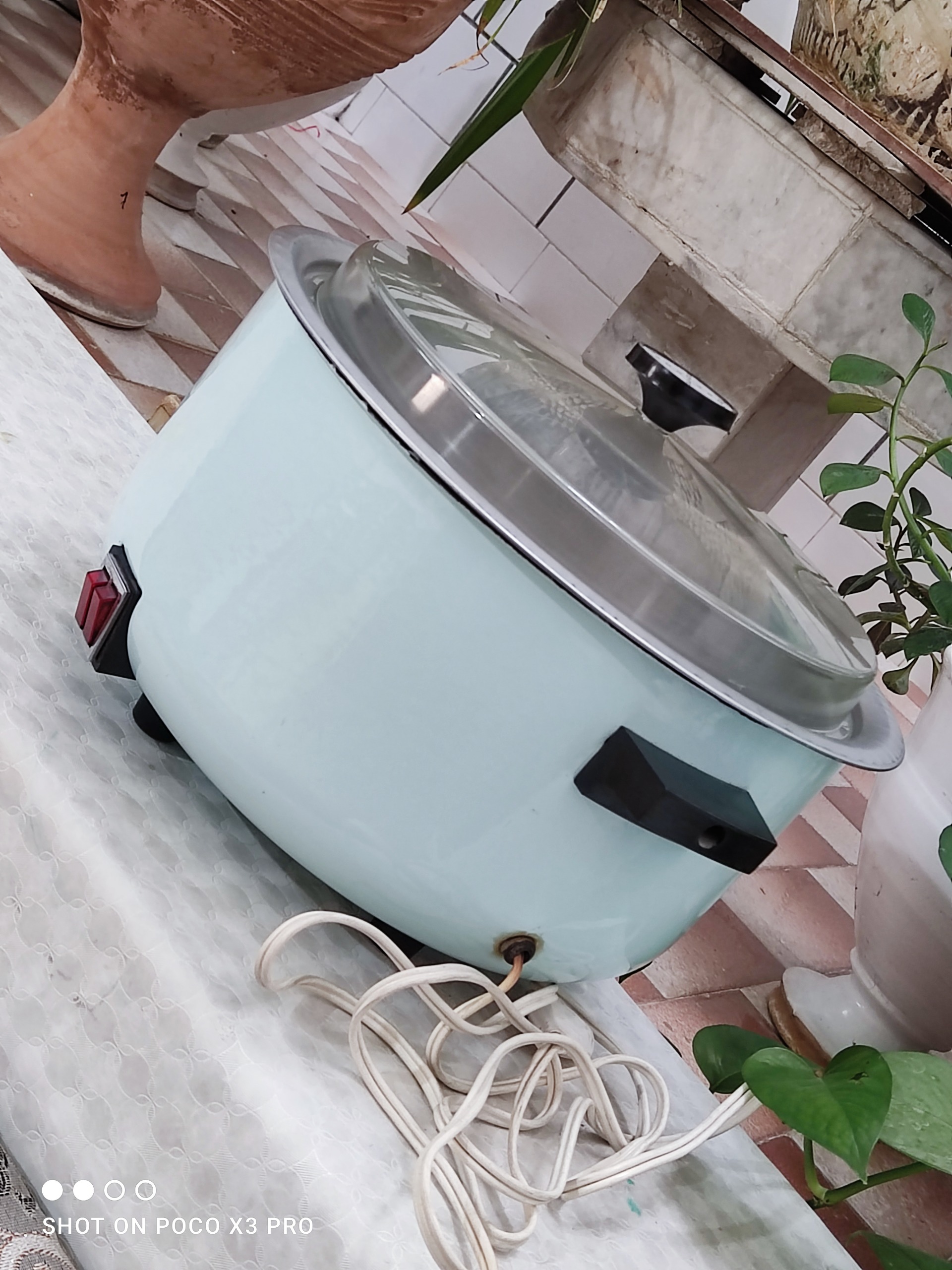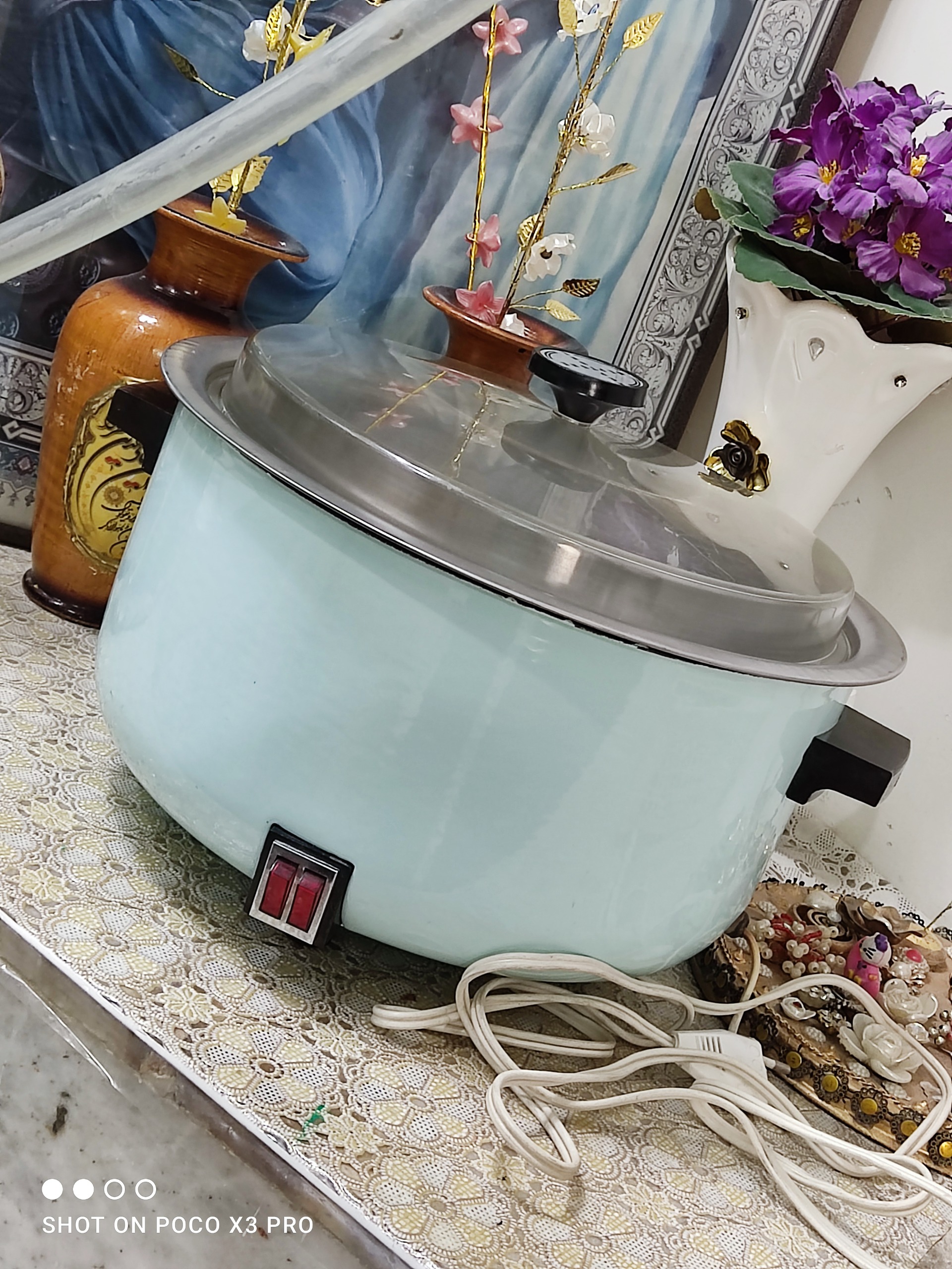 یک عدد آرام پز قدیمی مربوط به دهه پنجاه این پلو پز آرام پز یه آنتیک واقعیه شاید فقط چند مرتبه ازش استفاده شده یه خط و خش روش نیفتاده بسیار بسیار تمیز و بکر و سنگین کابلشم خیلی بلنده هر جا خاستی میتونی بذاری ظرف داخلش از استیل خالصه سرش از یه مدل پلاستیک خاص و بسیار شفاف چهار تا پایه داره دوتا دکمه داره دوتا هم دسته نشوز داره وزنش پاقعا سنگینه نشون دهنده قدمت و آلیاژ خوبشه کمیاب و زیرخاکی مطابق تصاویر
