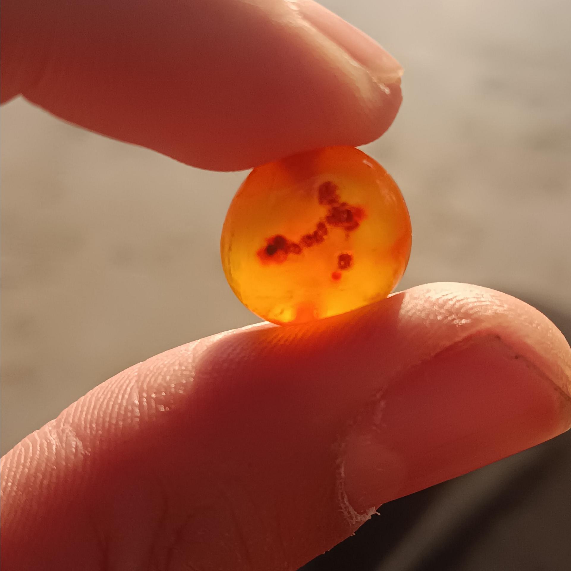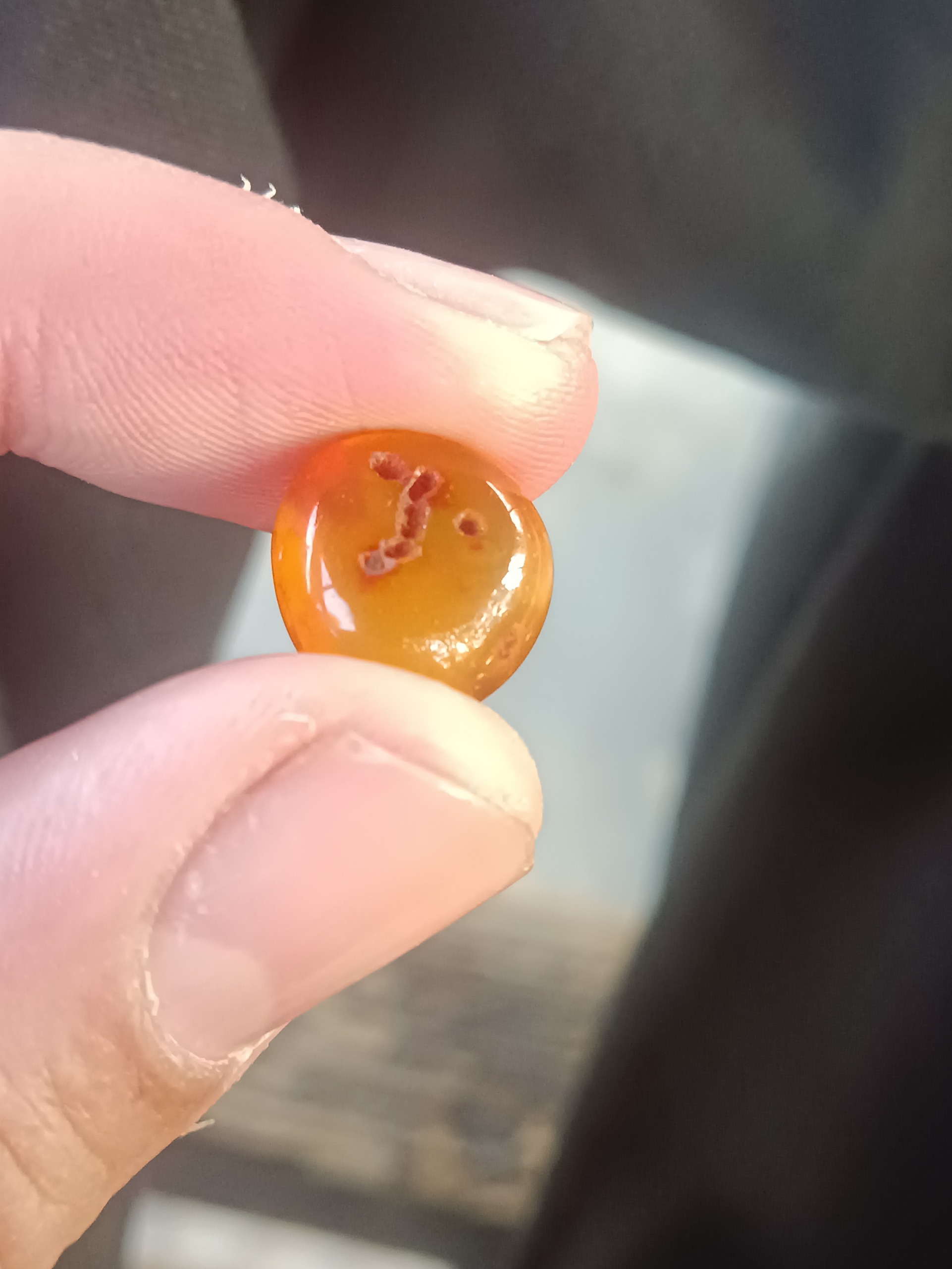 مهره نگین  آنتیک باستانی جنس گوهر سنگ بسیار سخت و آبدار عبور نور بالا تا حدی تلالو اوپالی داره منظورم اوپال ژله ای هست تقریبا نیم دایره منظمی داره و تراش دسته قدمت بالای 8قرن از کوهستان منطقه مهاباد کردستان کشف کردم و نشون دادم تو قدمتی بودنش شکی نیست و تقریبا یه عقیق خیلی باکیفیت بهم گفتن پشتش کلمه بز با سوراخ کاری نقش بسته که قرمز شده فونتش
