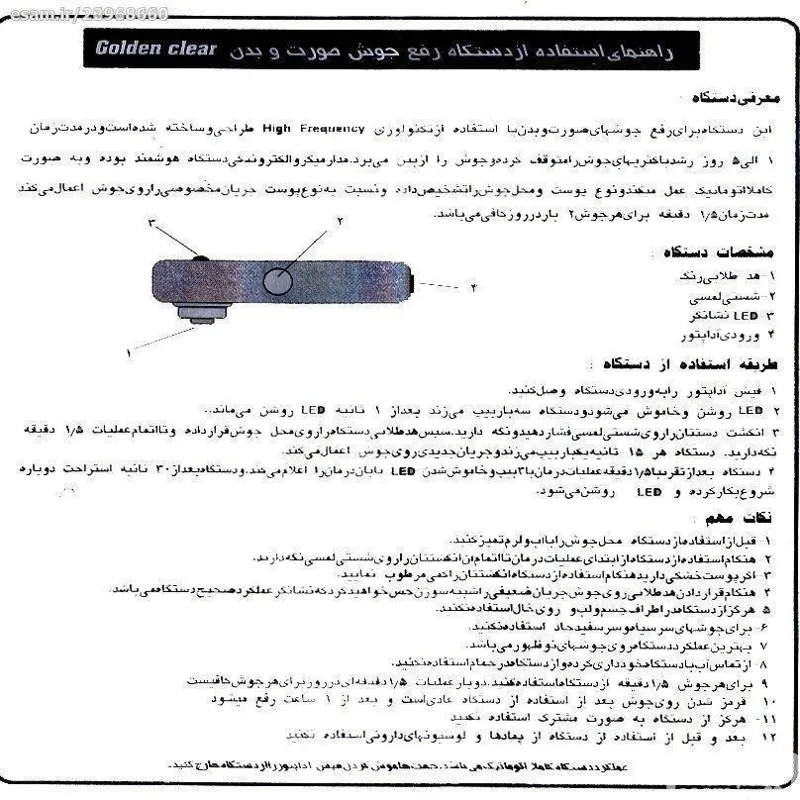 دوشاخه ی شارژر نیاز به مبدل دوشاخه دارد این دستگاه الکترونیکیGOLDEN CLEAR با آخرین تکنولوژی آلمان {مونتاژ مالزی } جهت ترمیم و درمان بموقع جوشهای صورت هست تعداد 4 عدد ازش موجود هست