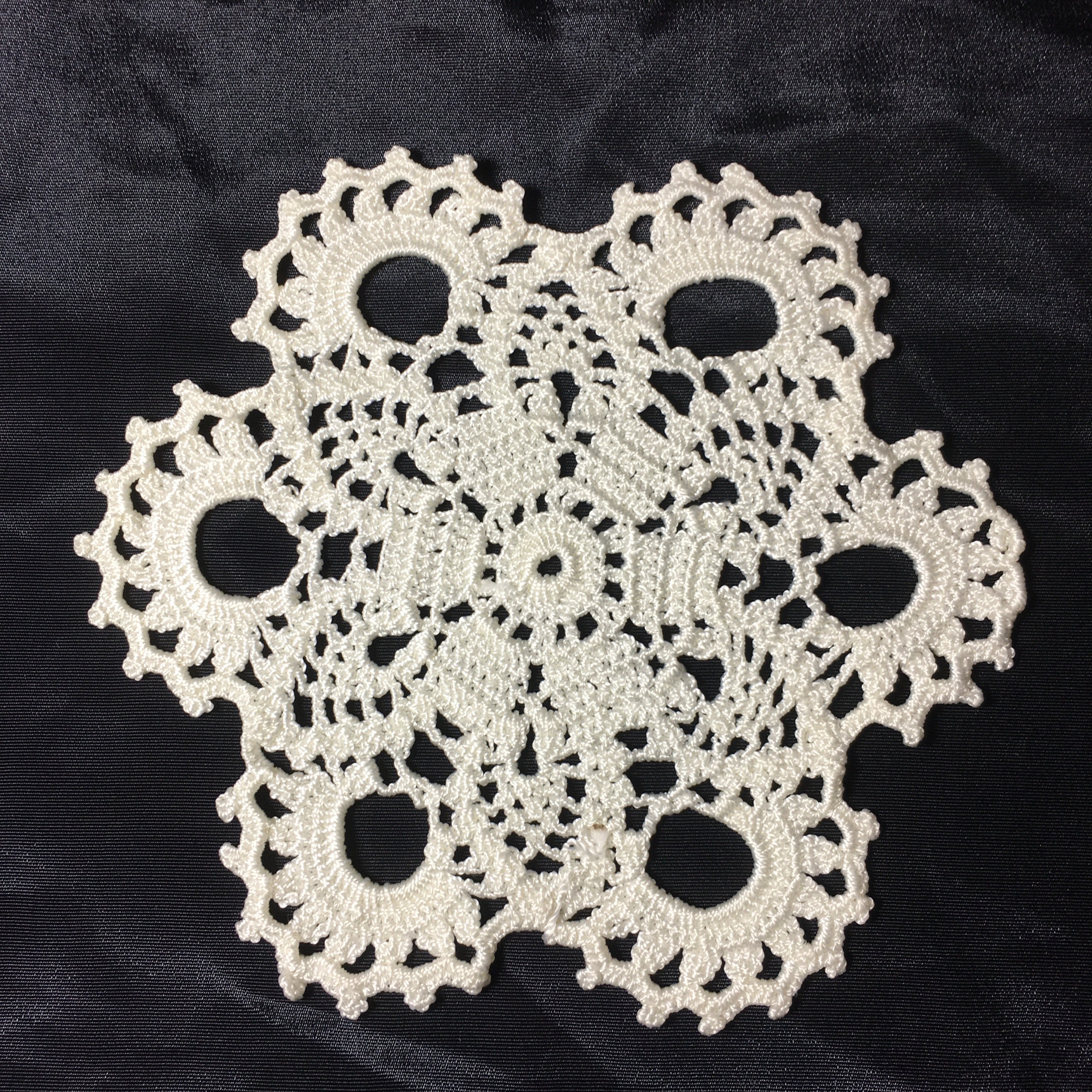 زیرلیوانی یا رومیزی کوچک قلاب بافی شده با نخ ابریشم، مناسب برای تزئین میز چای خوری، زیر شمع، گلدان یا لیوان.