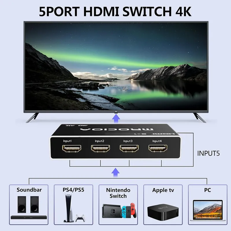 5 در 1 خروجی : تقسیم کننده HDMI فقط از ورودی و خروجی 5 دستگاه به 1 تلویزیون پشتیبانی می کند . این دستگاه از بسیاری از دستگاه های HDMI مانند PS5 / PS4 / XBOX SERIESX / XBOX ONE S / FIRE TV / APPLE TV / BLUE RAY پشتیبانی می کند .