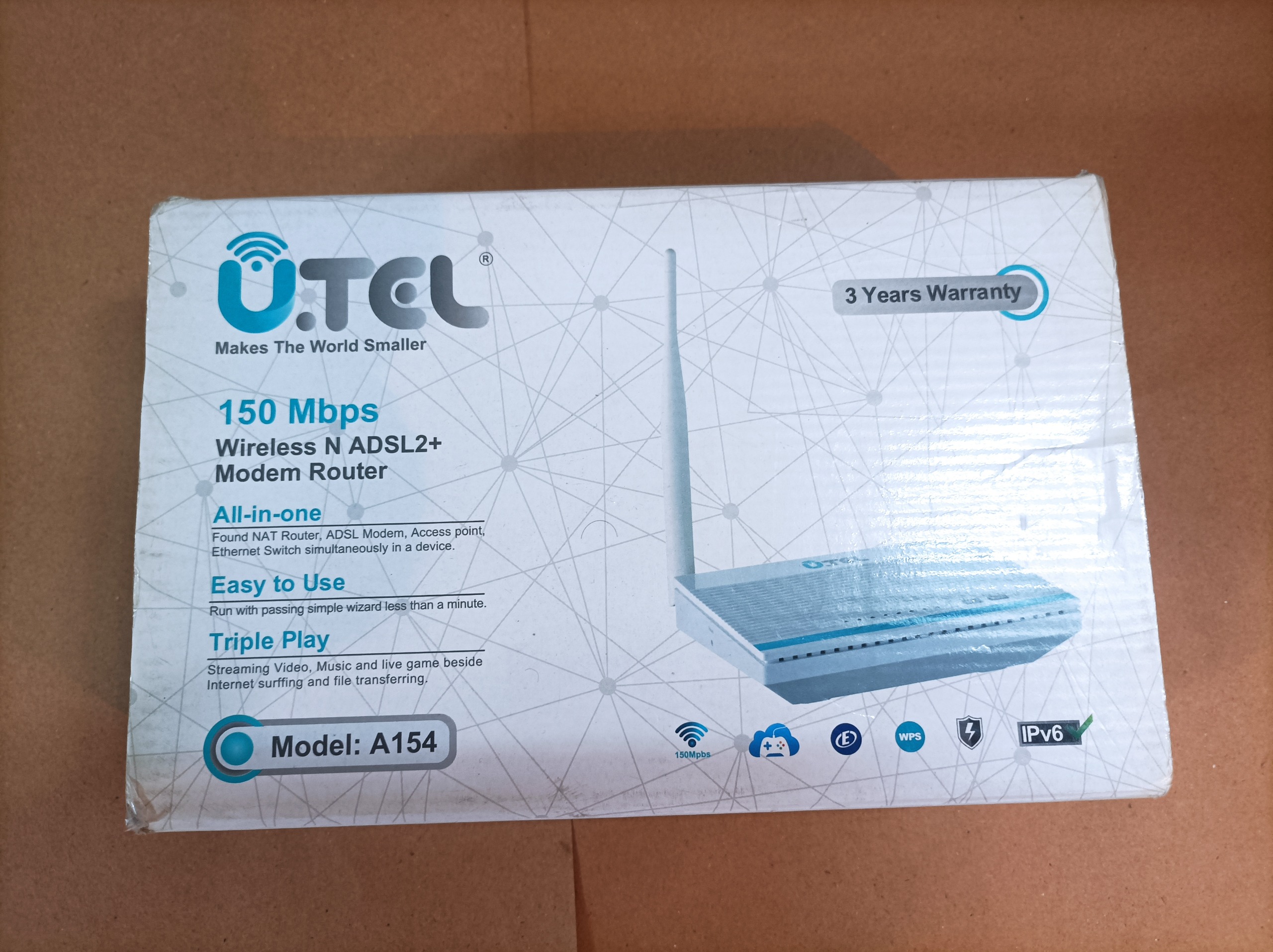 مودم وای فای یوتل مدل a154 تمیز و سالم با لوازم موجود در تصویر.قیمت نوی این مودم در بازار الان حدود دو میلیون تومان است.