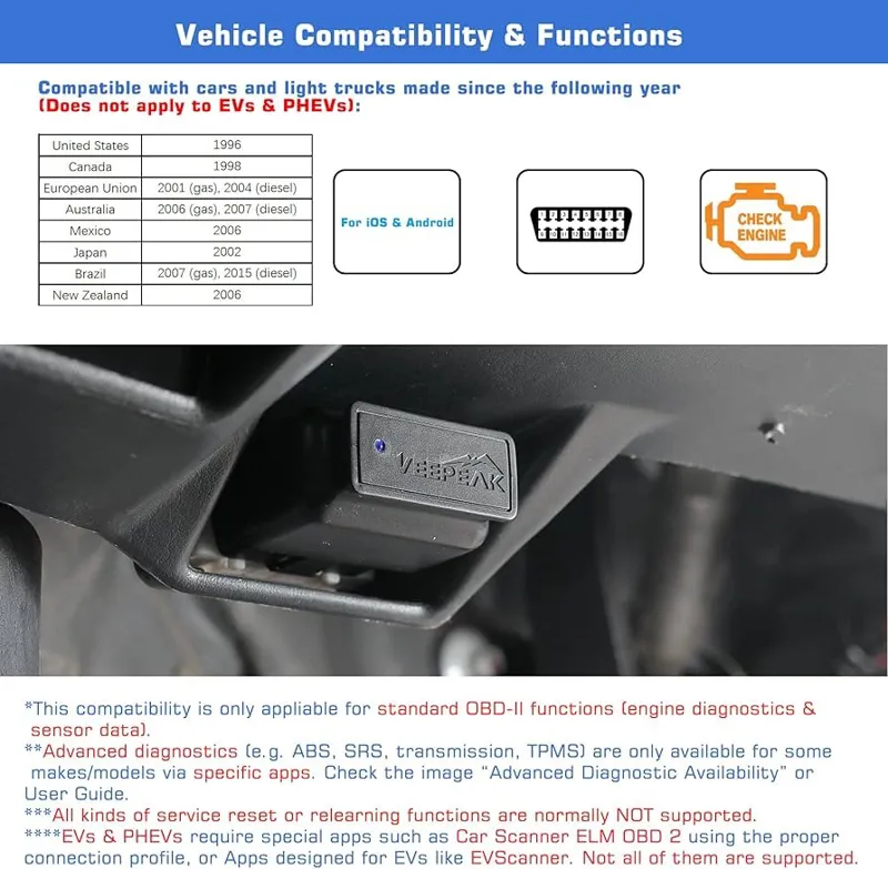 سازگاری با خودرو: سازگار با اکثر خودروها و کامیونهای سبک 1996+ در ایالات متحده برای عملکردهای تشخیصی عمومی OBD-II. برای خودروهای برقی، برای پروفایل اتصال مناسب، برنامه اسکنر خودرو را بررسی کنید یا قبل از خرید با Veepeak تماس بگیرید تا سازگاری را تأیید کنید. همه خودروهای برقی پشتیبانی نمیشوند.