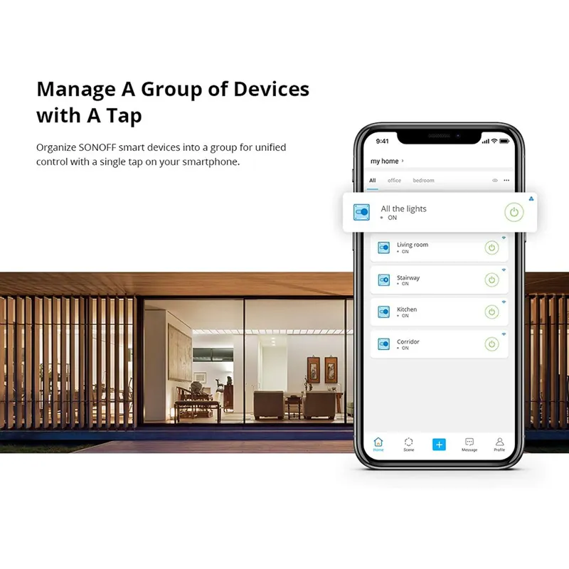 سناریوهای هوشمند : می توانید سناریوهای هوشمندی ایجاد کنید به طوری که یک دستگاه Sonoff دیگری را روشن یا خاموش کند ، یا چندین دستگاه را در یک گروه گروه بندی کنید که می توانند با یک ضربه با هم کار کنند .