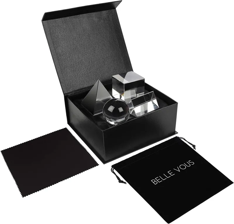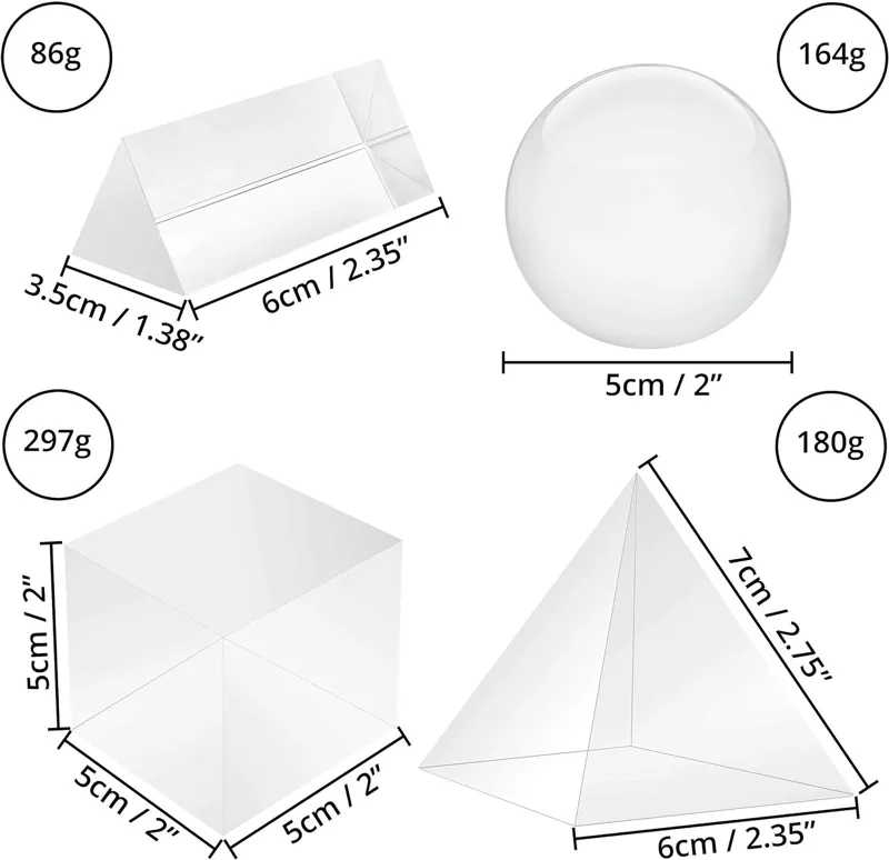 مثلث، کره، هرم و مکعب کریستال BELLE VOUS K9 (بسته 4 عددی) - منشور منشوری برای عکس - کیف، پارچه میکروفیبر و جعبه هدیه - طیف نور لنز شفاف فیزیکی