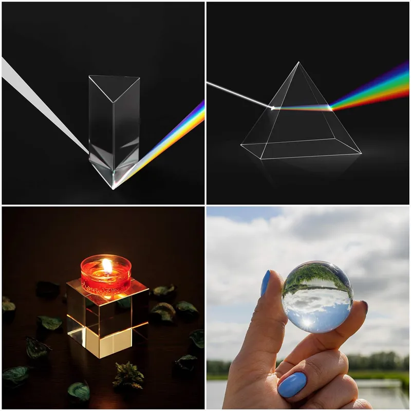 • طیف رنگی زیبا: این مجموعه شامل یک منشور مثلثی و یک منشور هرمی است. با این منشورهای کریستالی می توانید یک پرتو نور را به اجزای مختلف طیف نور جدا کنید تا تمام رنگ های رنگین کمان را نشان دهید. با این کار می توانید عکس های جالبی ایجاد کنید و برای آموزش فیزیک طیف نور عالی است. منشورها از کریستال شفاف K9 ساخته شده اند. لطفا تصاویر و توضیحات را برای ابعاد هر منشور ببینید.