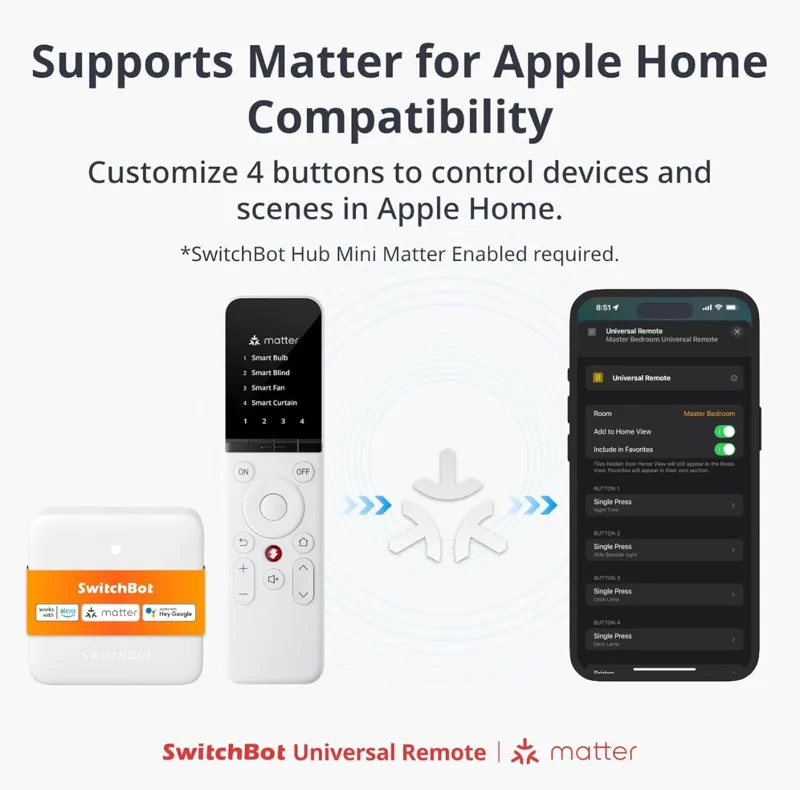 اولین ریموت پشتیبانی شده توسط Matter در جهان: با استفاده از Matter، میتوان سایر دستگاههای برند خانه هوشمند مانند چراغهای Philips Hue، پردههای IKEA و موارد دیگر را کنترل کرد. همچنین باعث میشود دستگاههای SwitchBot یا دستگاههای IR از Matter پشتیبانی کنند. دستیابی