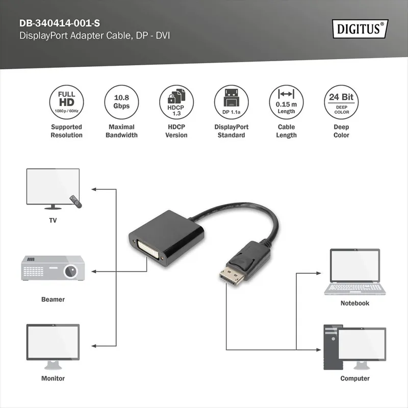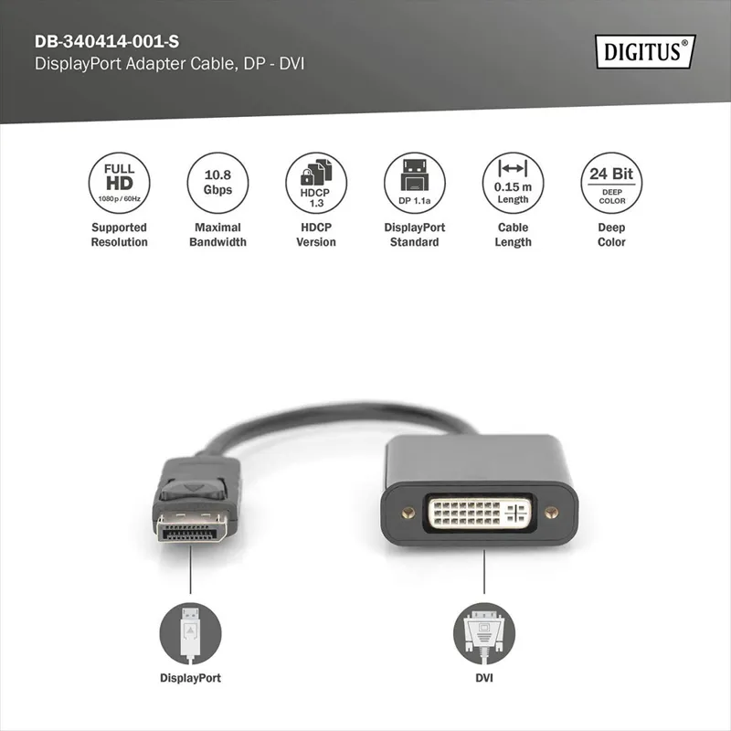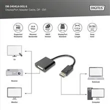 آداپتور DisplayPort فعال از DIGITUS® سیگنال های DisplayPort را به سیگنال های DVI تبدیل می کند . وضوح تصویر Full HD (1080p) با فرکانس تا 60 هرتز پشتیبانی می شود . HDCP 1.3 و 24 بیتی DeepColor نیز هستند پشتیبانی می شود ، و همچنین DVI 1.0 . پیش تقویت کننده نصب شده و محافظ دوگانه کیفیت انتقال درجه یک به نمایشگر HD را تضمین می کند . دوشاخه DVI به طور کامل استفاده شده است (24+5) . حداکثر وضوح تصویر پشتیبانی شده: 1920 x 1080 p با 60 هرتز