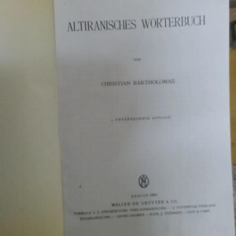 فرهنگ لغت جامع بزرگ و مفصل ایران باستان به زبان آلمانی - نویسنده : کریستین بارتلمیه خاور شناس و ایران شناس معروف آلمانی - قطع رحلی جلد گالینگور 1979ص دو ستونی - تجدید چاپ و کپی رایت سال 1961 میلادی از روی 1904در خارج از ایران در شهر هامبورگ کشور آلمان -