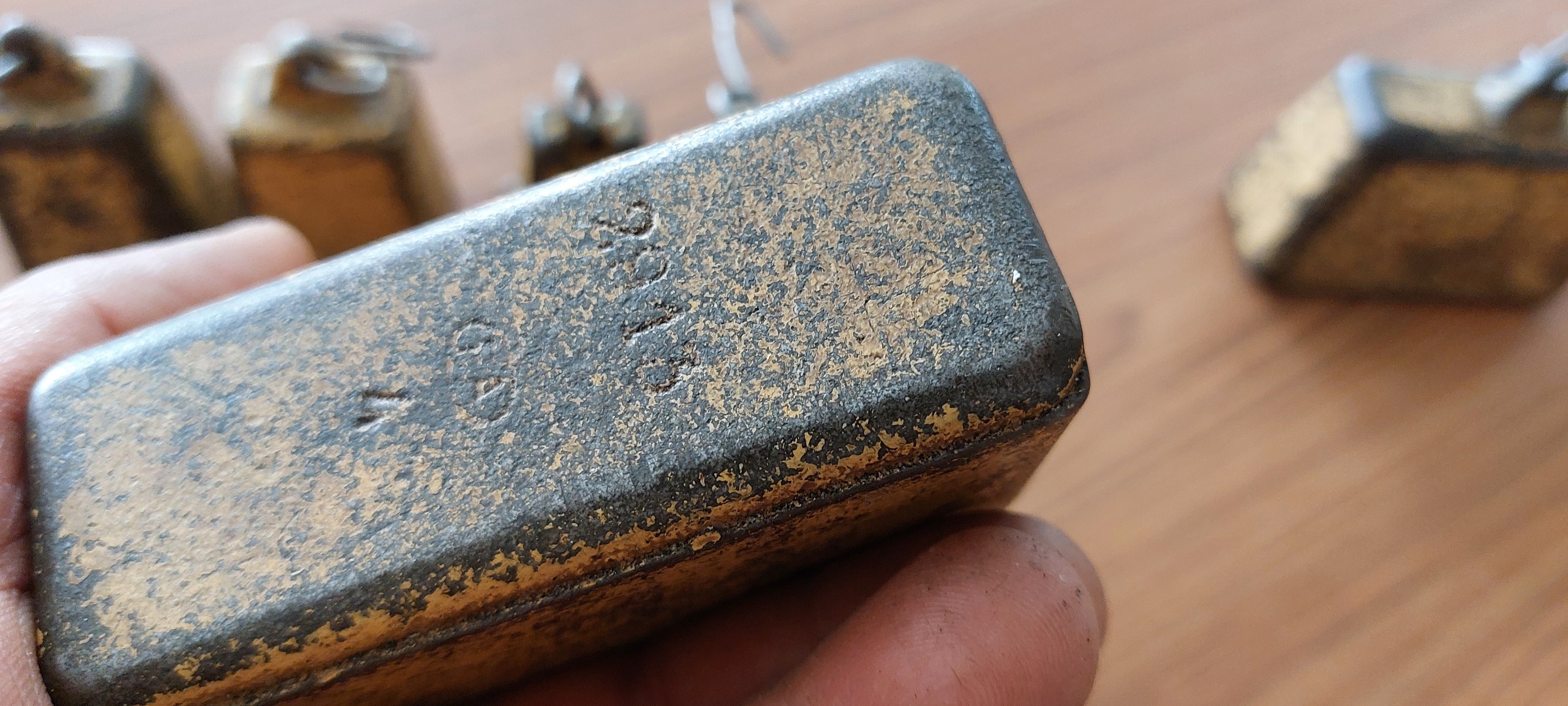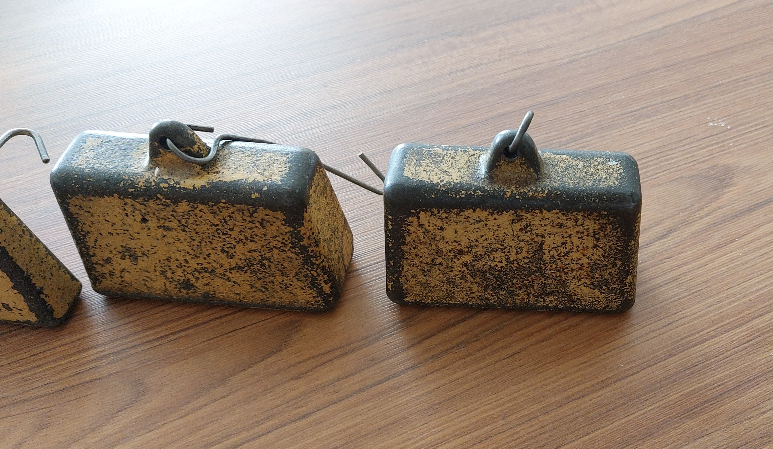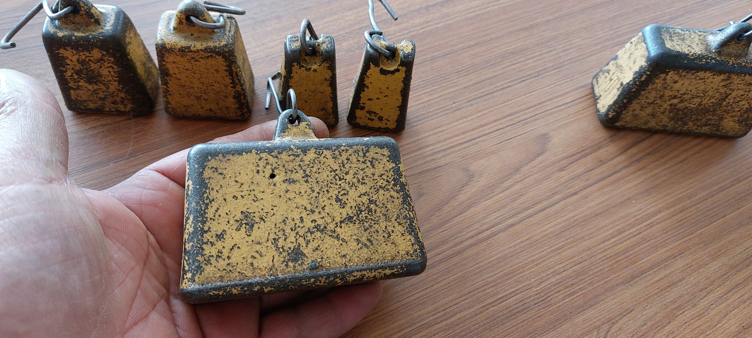 6عدد وزنه قدیمی باسکول احتمال زیاد خارجی . 3جفت هستند. وزنها بزرگ ها 1کیلویی . متوسط ها 300 گرمی . و کوچیک ها 150 گرمی . اندازه ها با ترازو آشپزخانه گرفته شده و احتمال دقیق نبودنشون هست. اگه واستون مهم هست قبل از خرید اطلاع بدید تا دقیق اندازه گیری بشه.