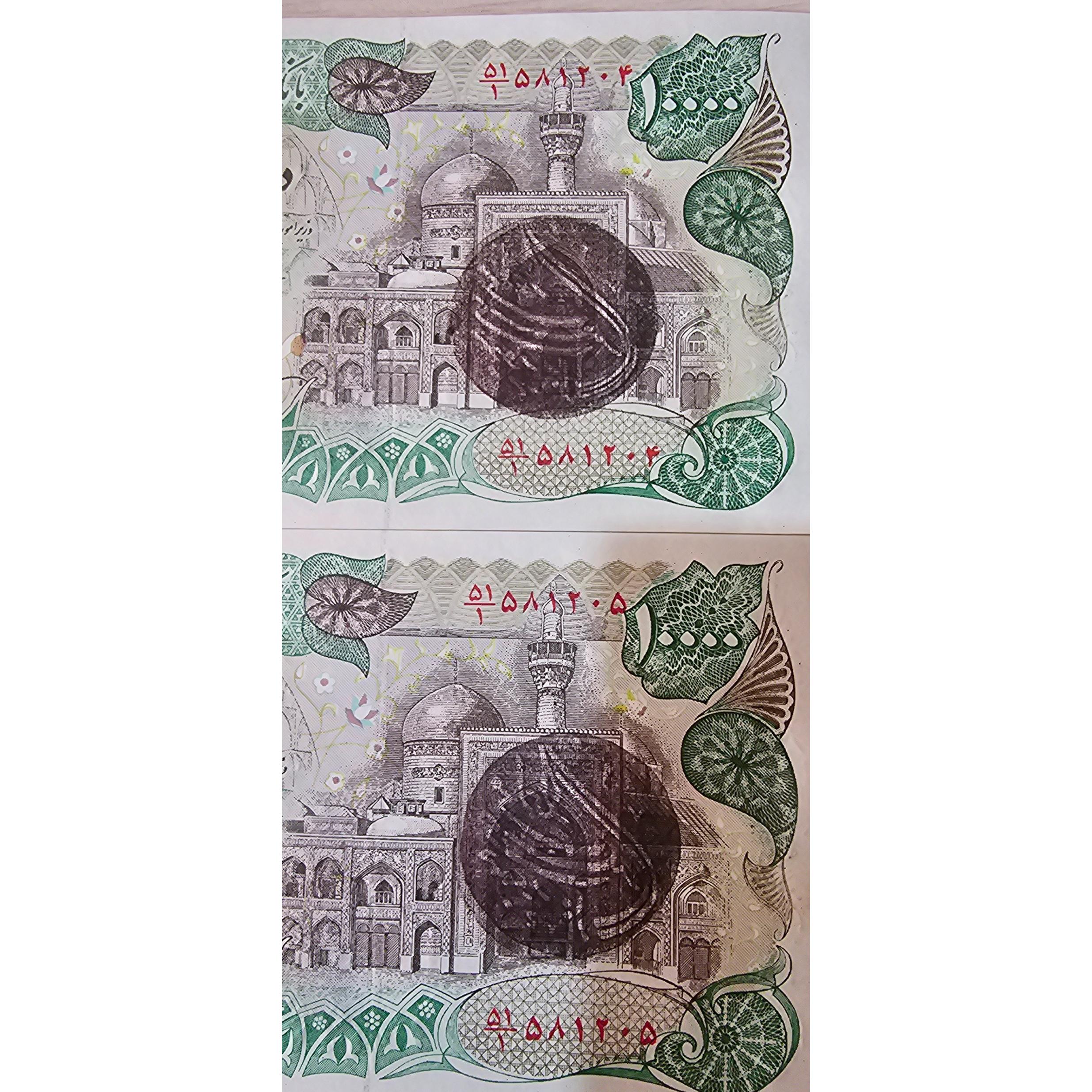 یک جفت اسکناس 10،000ریالی بارگاهی 2مهر ارور قرینه و وارونگی مهر در هر 2 اسکناس همسان .کسر 1.کیفیت سوپر بانکی .بسیار بسیار نایاب و کلکسیونی .لطفا تحقیق کنید اسکناسها اصل میباشد چاپ پاکستان و به تازگی وارد ایران شده اند .بقیمت برسه ارسال میشه .مبارک صاحبش..