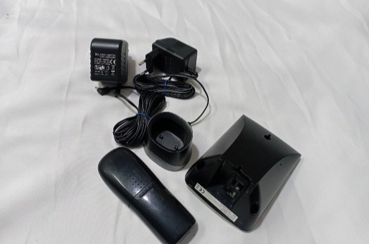 دقت شود تلفن باتری همراهش نیست تک گوشی بیسیم . دو عدد پایه شارژر دارد یکیش خط تلفن میخوره و هر دو فعال کار میکنه دو عدد آداپتور با سیم بلند . هر دو پایه سالم . تلفن سالم و تست شده . رنگ بعضی از دکمه ها رفته . فقط باتری ندارد خودم با باتری نیم قلمی معمولی تست کردم دو عدد باتری شارژی باید براش بخرین