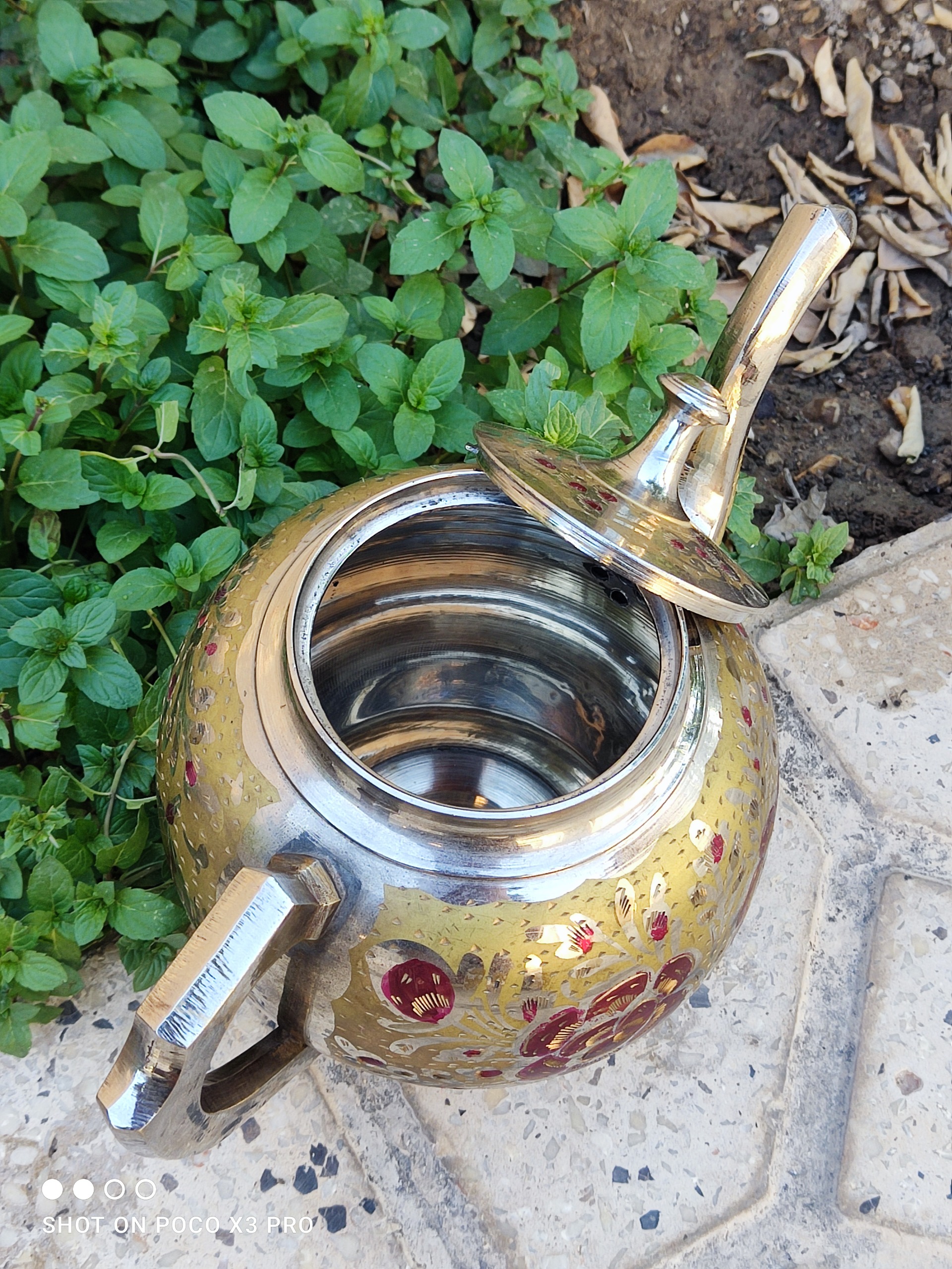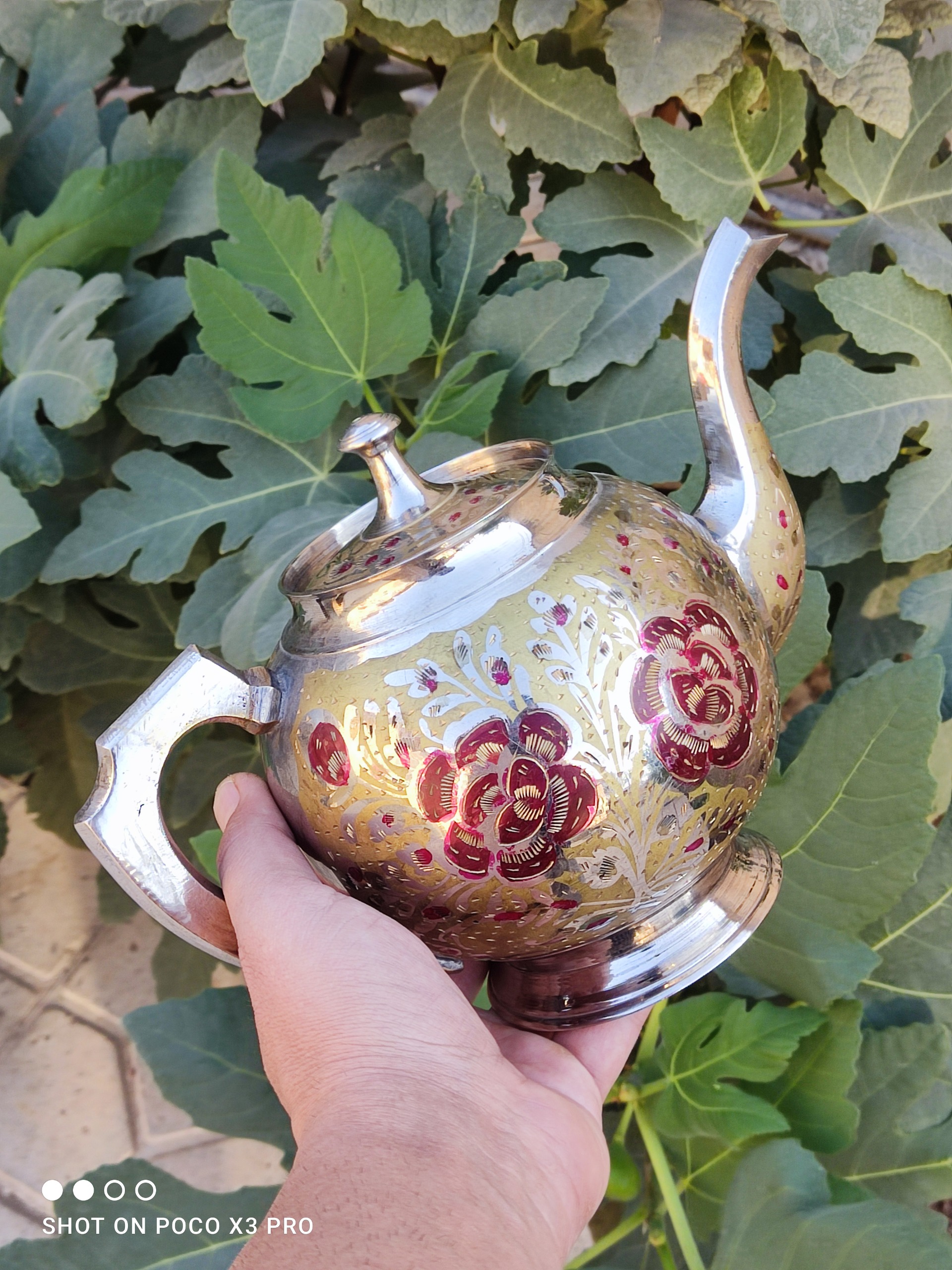 قوری برنجی قدیمی و بی نهایت زیبا و بکر مطابق تصاویر این قوری سایزش متوسطه فکنم حدودا یک لیتری گنجایشش باشه از زیبایی این قوری هر چی بگم کمه بسیار زیباتر از عکسشه بسیار بسیار سنگین وزن و محکم نو نو آک آب داخلش نرفته حتی اثر انگشت روش نیس