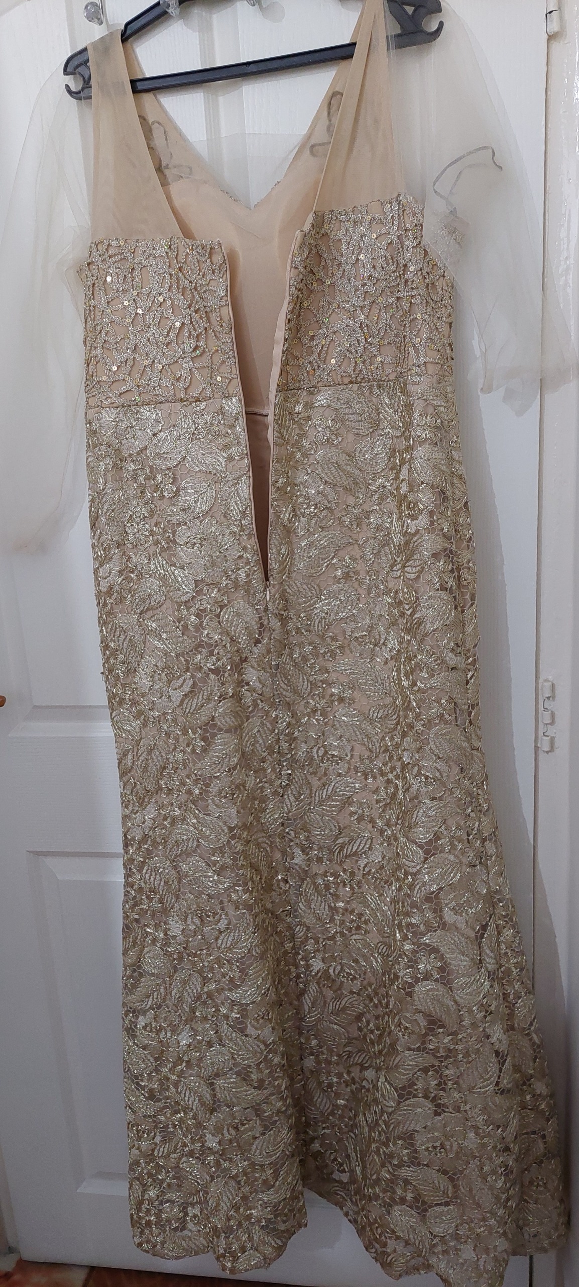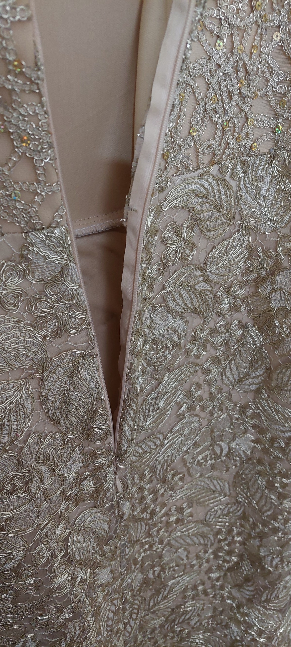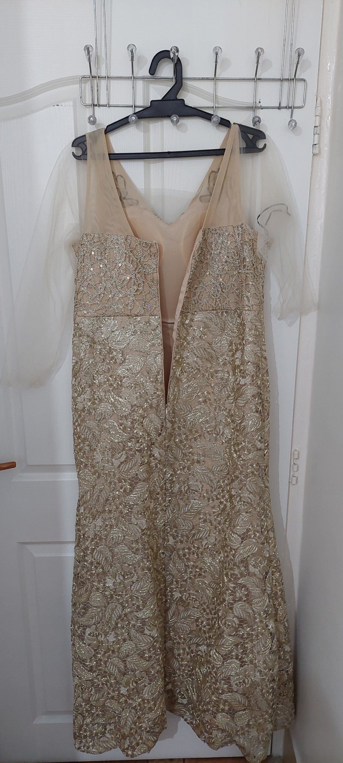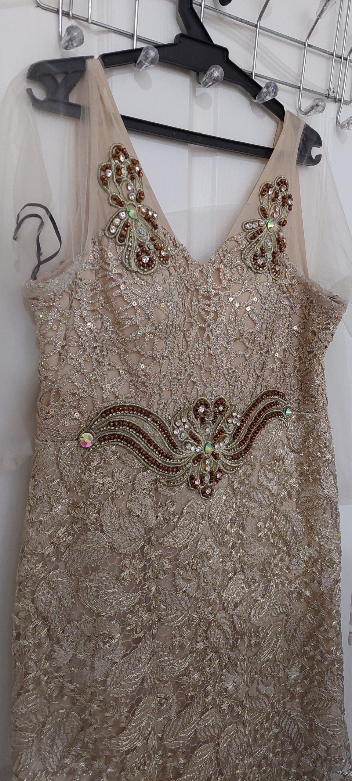 پیراهن زنانه مجلسی گیپور نو فقط دوساعت استفاده شده سایز44تا48 جلوی سینه منجوق دوزی شده.روی پیراهن آستین توری جداگانه دوخته شده.