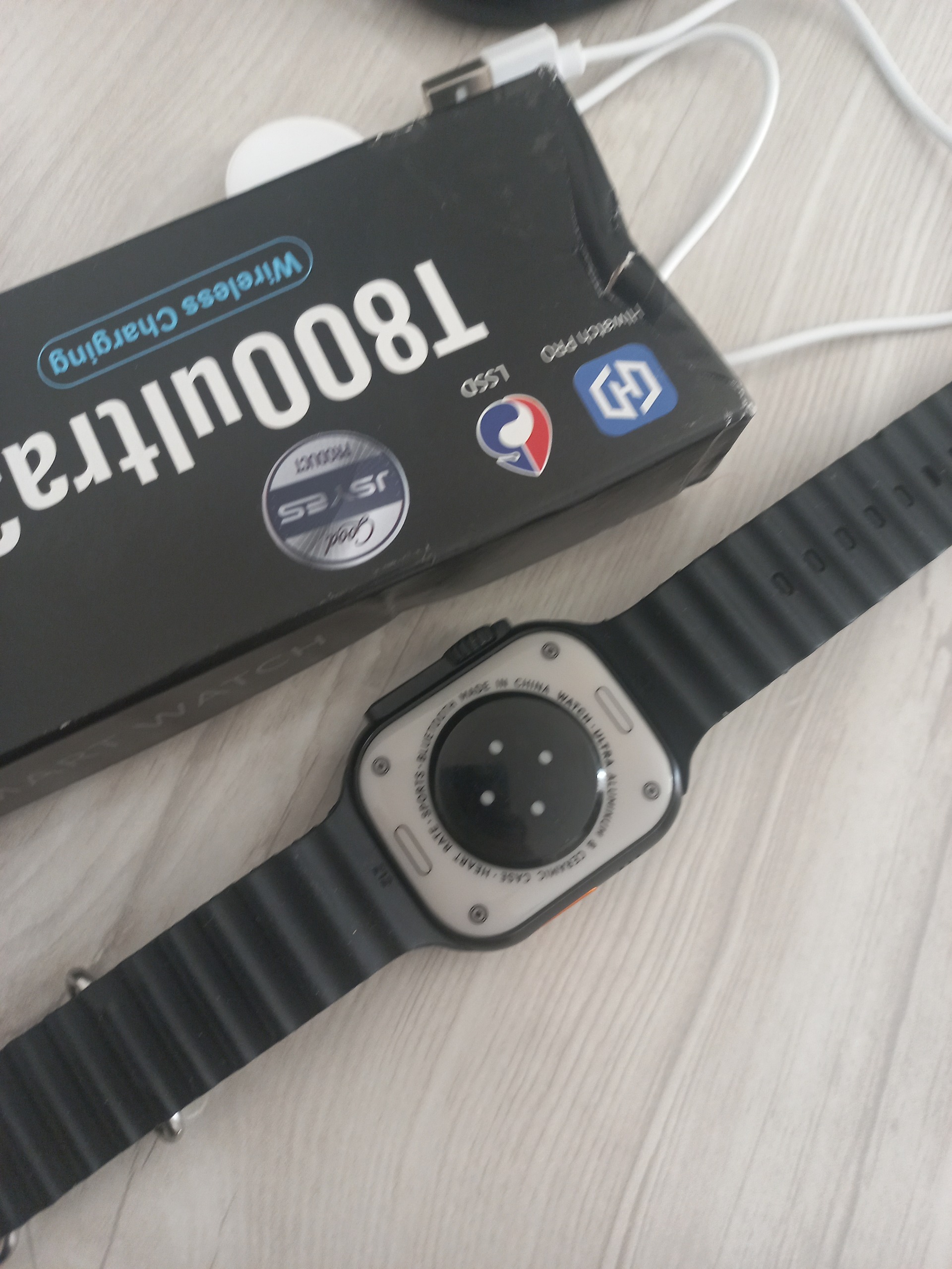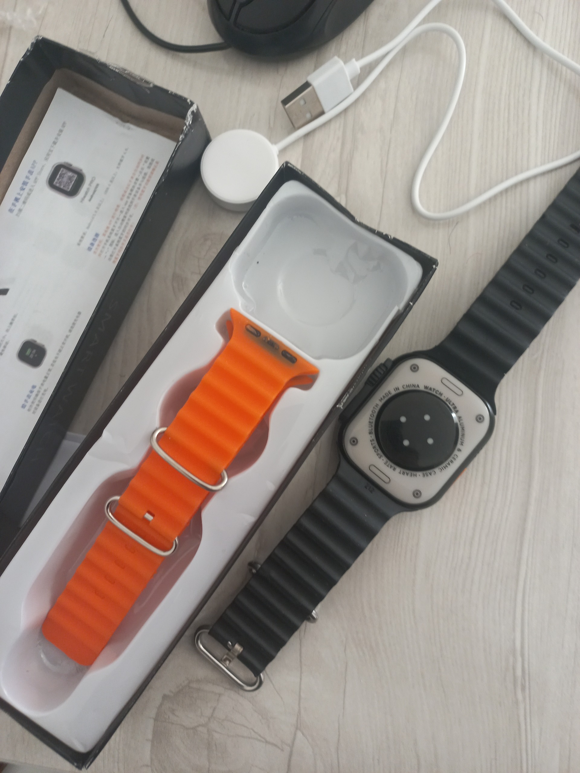 ساعت هوشمند t800 اولترا3 دارای دو بند مشکی و نارنجی و شارژر وایرلز و قبلیت نصب تصویر زمینه و دکمه های ورزشی و برنامه های پیام رسان موسیقی و...