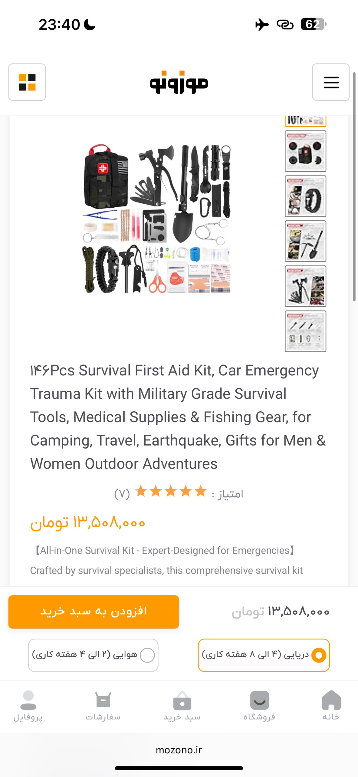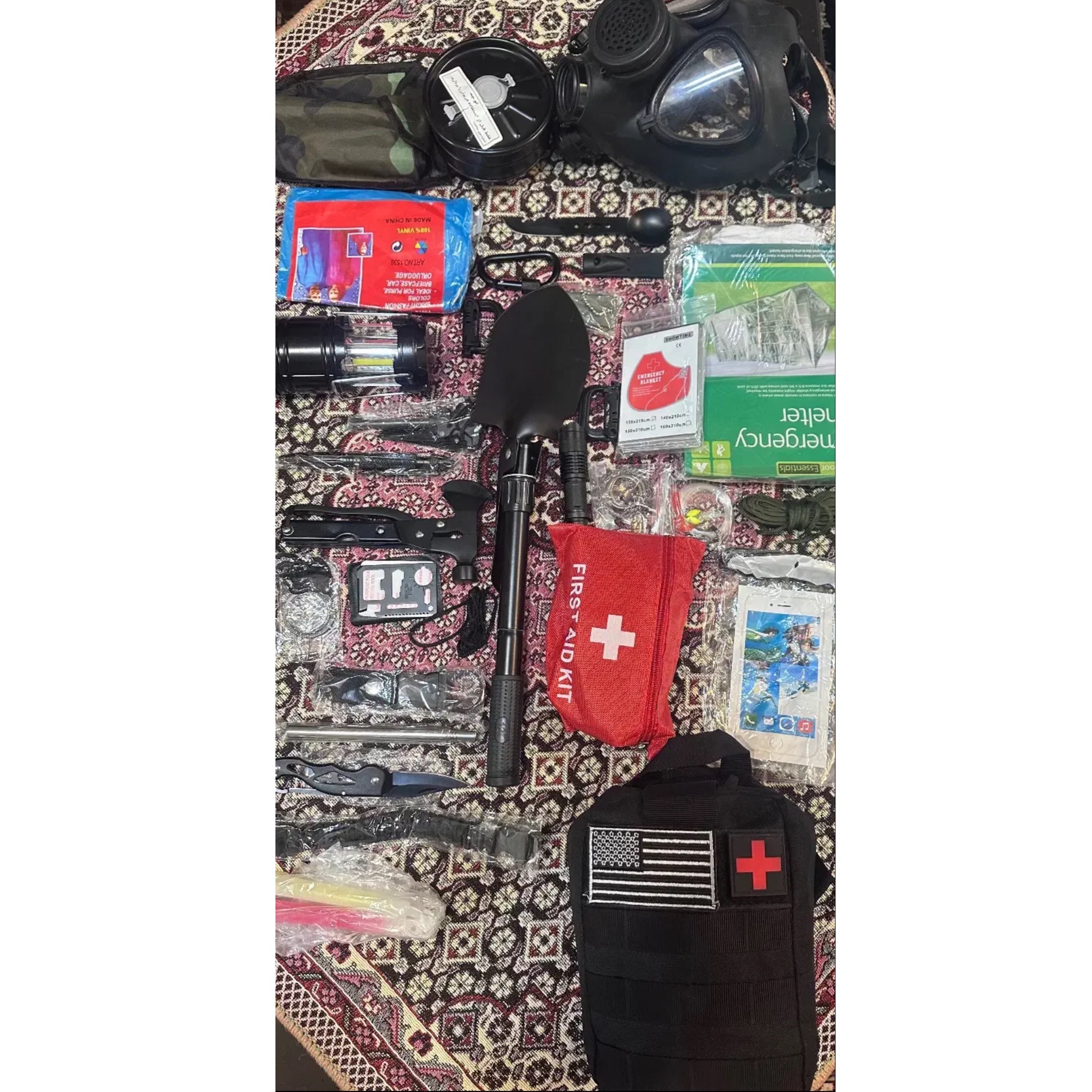 یک عدد کیت بقا به همراه گاز کمپینگ و ماسک شیمیایی خریداری شده از امازون امارات با نرخ فعلی حداقل 11 میلیون هزینه داره. کیت بقا و نجات در طبیعت (250 در 1)   مناسب برای: کمپینگ، کوهنوردی، شکار، سفر، طبیعتگردی و ماجراجویی.  شامل تجهیزات متنوع:   ابزار چندکاره (تبر 15 کاره، بیل 4 کاره، کارت 11 کاره، دستبند پاراکورد 4 کاره، قاشق 7 کاره و ) وسایل ضروری کمپ (چادر اضطراری، پتو نجات، طناب، کارابین، سوت نجات، چراغ قوه، چخماق آتشزن و ) تجهیزات ماهیگیری (قلاب، نخ، طعمه و ) کیف کمکهای اولیه کامل (باند، گاز استریل، پد الکلی، چسب زخم، قیچی، پنس و ) سایر لوازم (چاقو ضامندار، اره زنجیری، قطبنما، دستکش، پانچو، کاور موبایل ضدآب و )