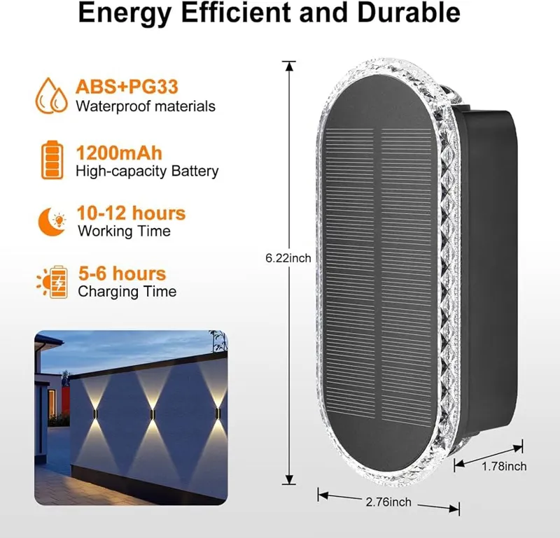 انرژی خورشیدی بادوام: تا 10 تا 12 ساعت نور مداوم پس از شارژ کامل نور خورشید. به طور خودکار در طول روز شارژ میشود و هنگام غروب روشن میشود - بدون سیمکشی، بدون قبض برق. طراحی چراغ دیواری بالا و پایین: طراحی دو پرتو، درخشش محیطی مدرنی را هم به سمت بالا و هم به سمت پایین ایجاد میکند - روشنایی لایهای و جذابیت خاصی به هر دیوار باغ، حصار یا مسیری اضافه میکند.
