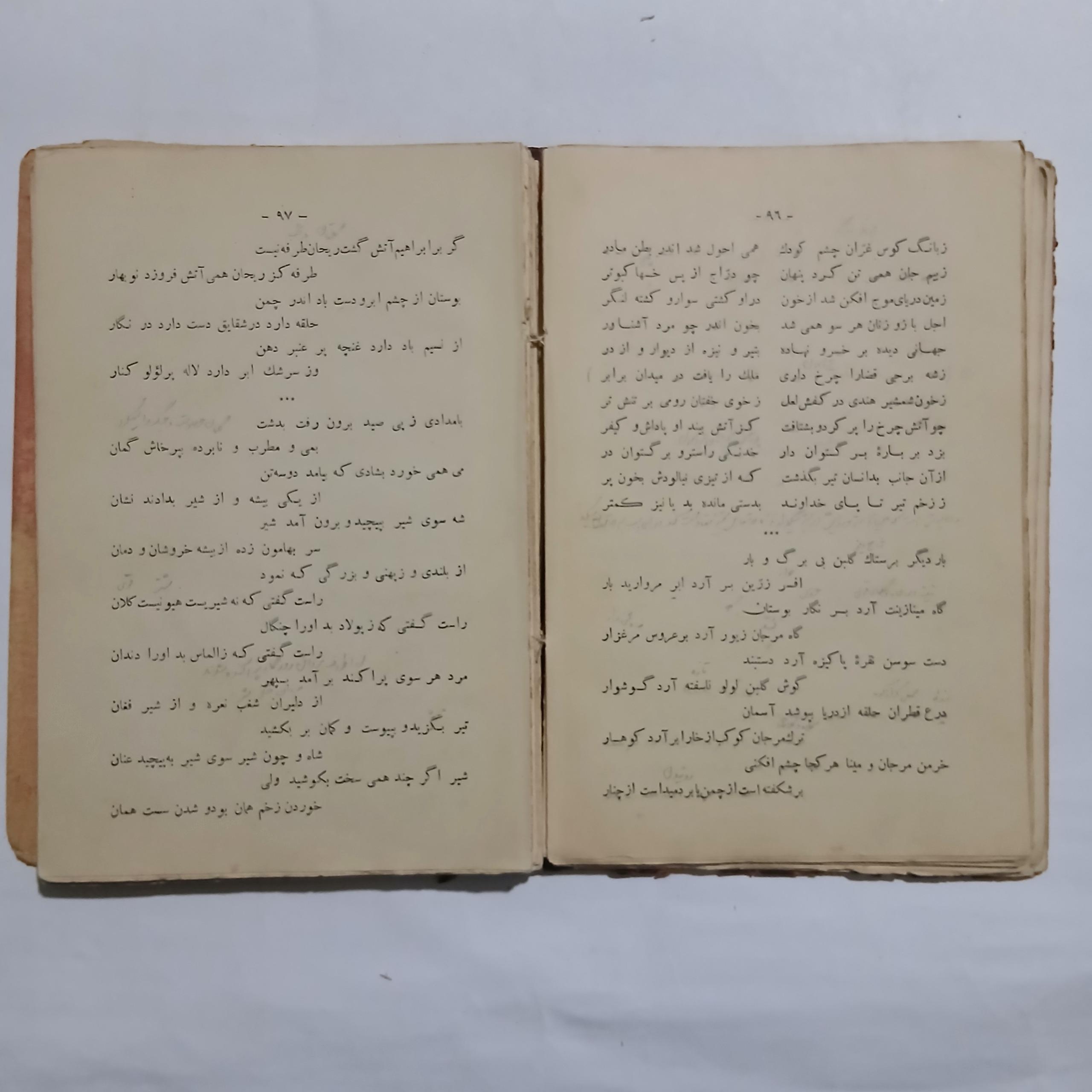 پرانتز و یا ضربدر هایی در ابتدای سطور با مداد و همینطور نکته نویسی و یا معنی کلمات دشوار بالای کلمات با مداد در 20 30 صفحه ای وجود دارد