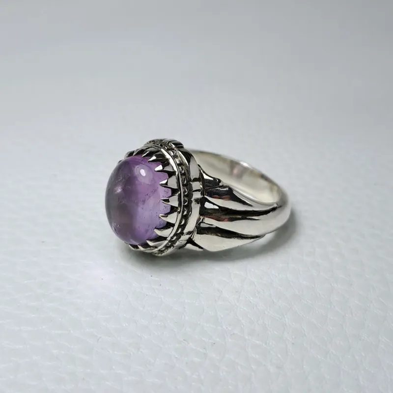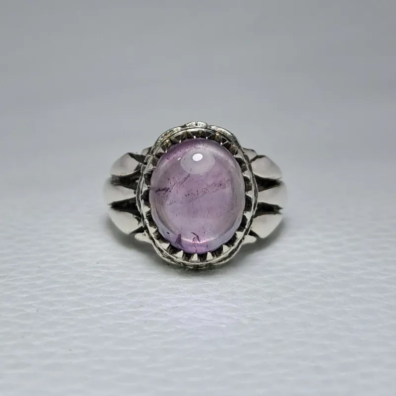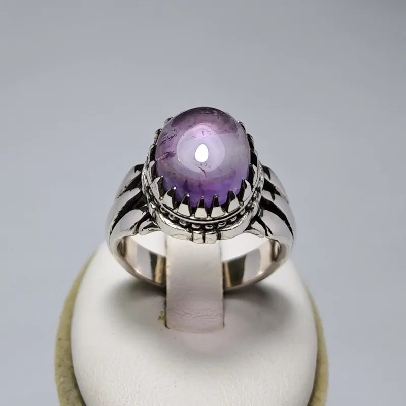آمیتیست معدنی کاملا طبیعی با ادخالِ یخدار  و نچرال. تراش دامله سنتی ابعاد نگین: 10×13.5 میلیمتر، کاملا طبیعی با رکاب نقره زیبا مدل پنجی دورچنگ، عیار استاندارد 925 سایز رکاب 62-61 جوندار و شکیل و خوش دست