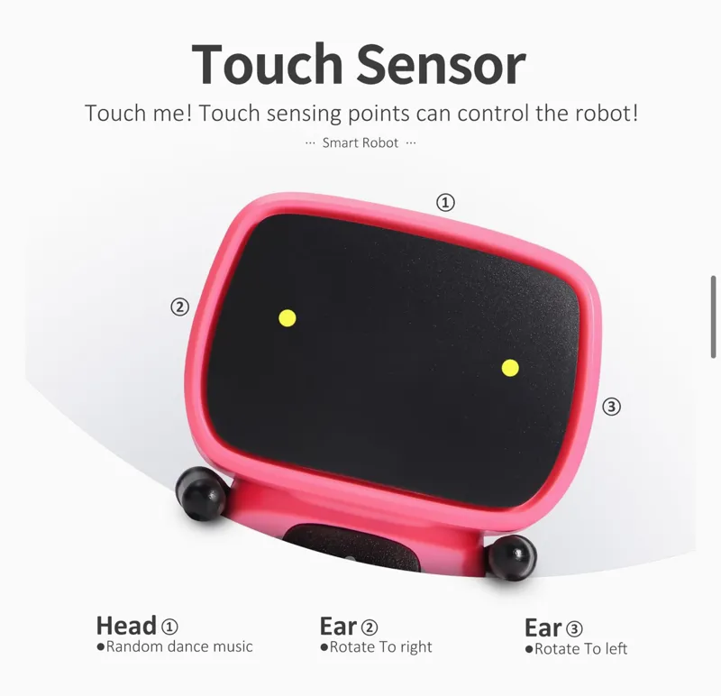 کنترل لمسی و کنترل صوتیروبات به جلو/عقب حرکت میکند، با لمس ناحیه حسگر به چپ/راست میچرخد، کنترل آن آسان است و لذت میبرد. هنگامی که ربات در حالت کنترل صوتی است می توانید به ربات فرمان دهید و ربات مطابق دستور شما به شما پاسخ خواهد داد.