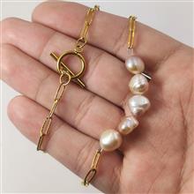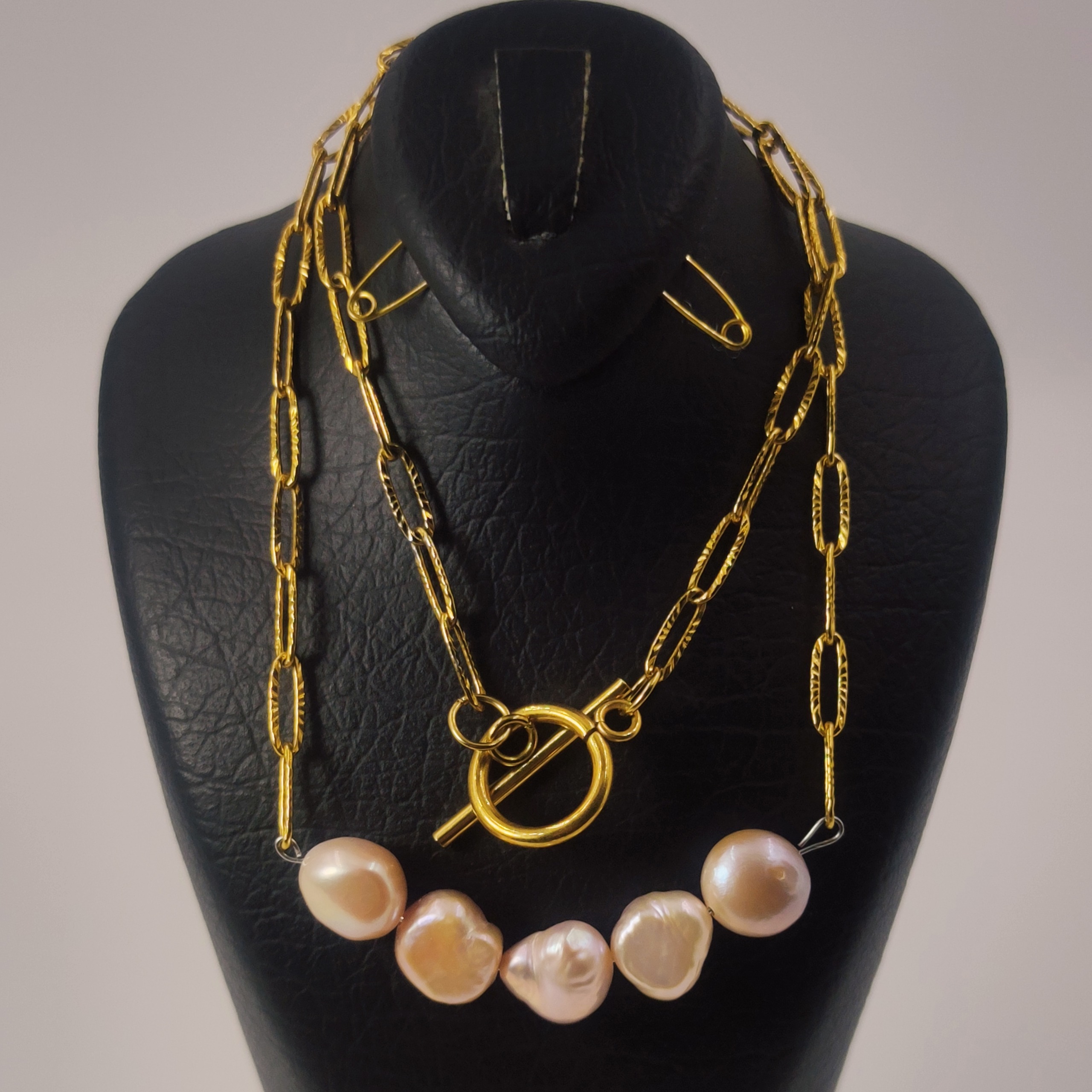 گردنبند استیل طلایی و مروارید های باروک پرورشی هند