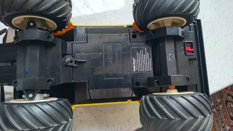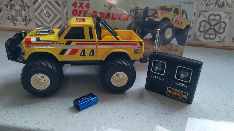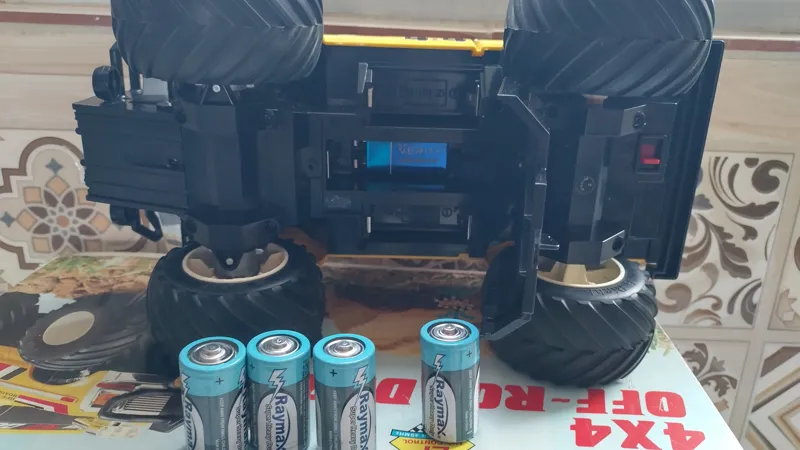 ماشین با یک باتری کتابی 9 ولت داخل کنترل و یکی داخل ماشین به همراه 4 عدد باتری 1٫5 ولت سایز c کار میکنه که ضعیف شدن و ماشین سنگین حرکت میکنه