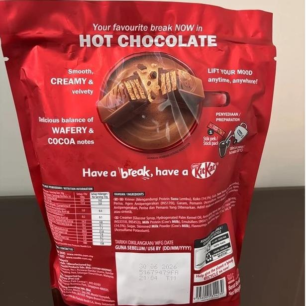 - طعم شکلاتی قوی و اصیل: به دلیل استفاده از کاکائوی باکیفیت و عصاره شکلات کیت کت، این هات چاکلت طعمی فوقالعاده غنی دارد.