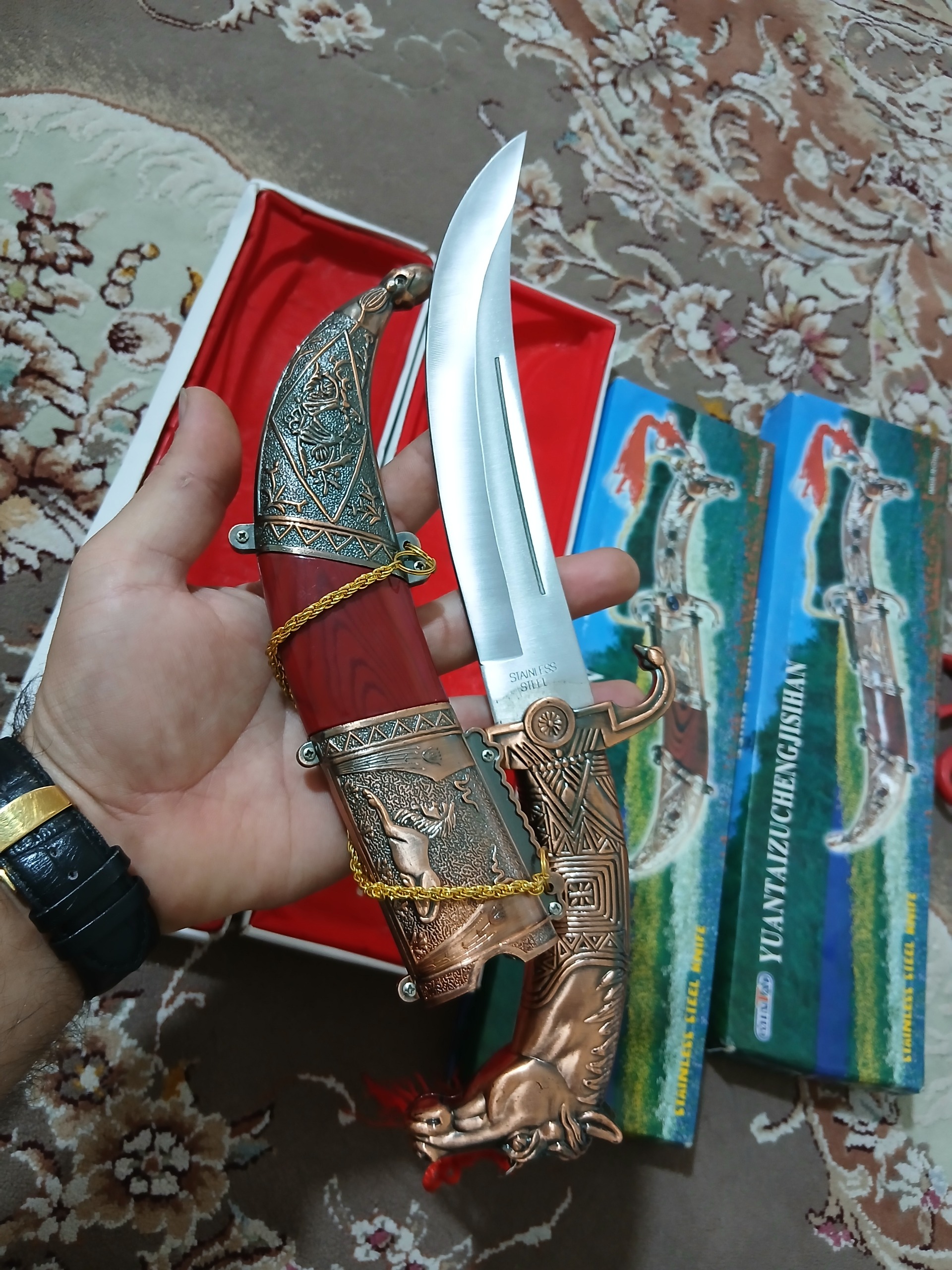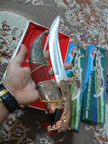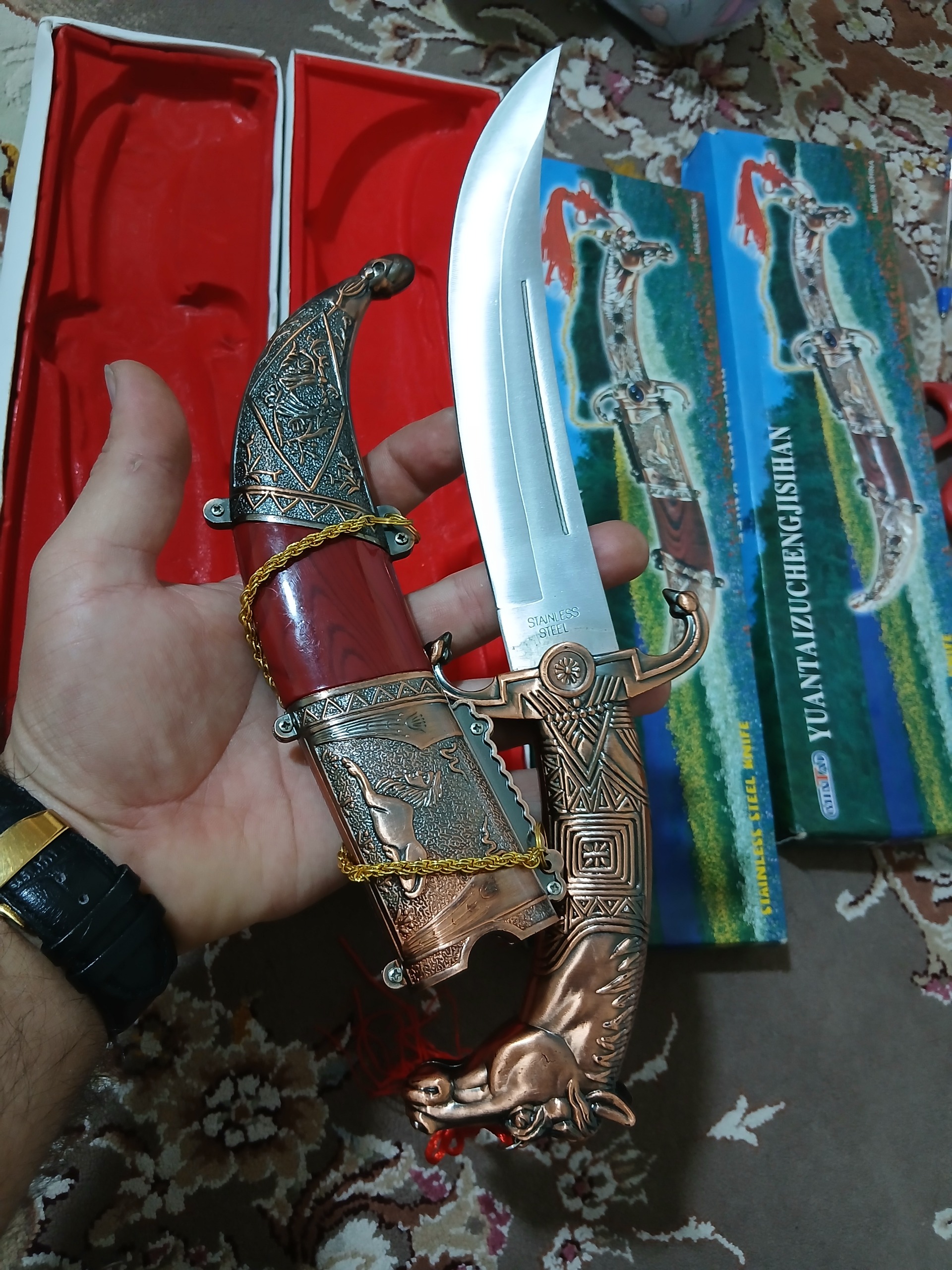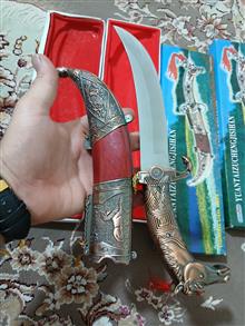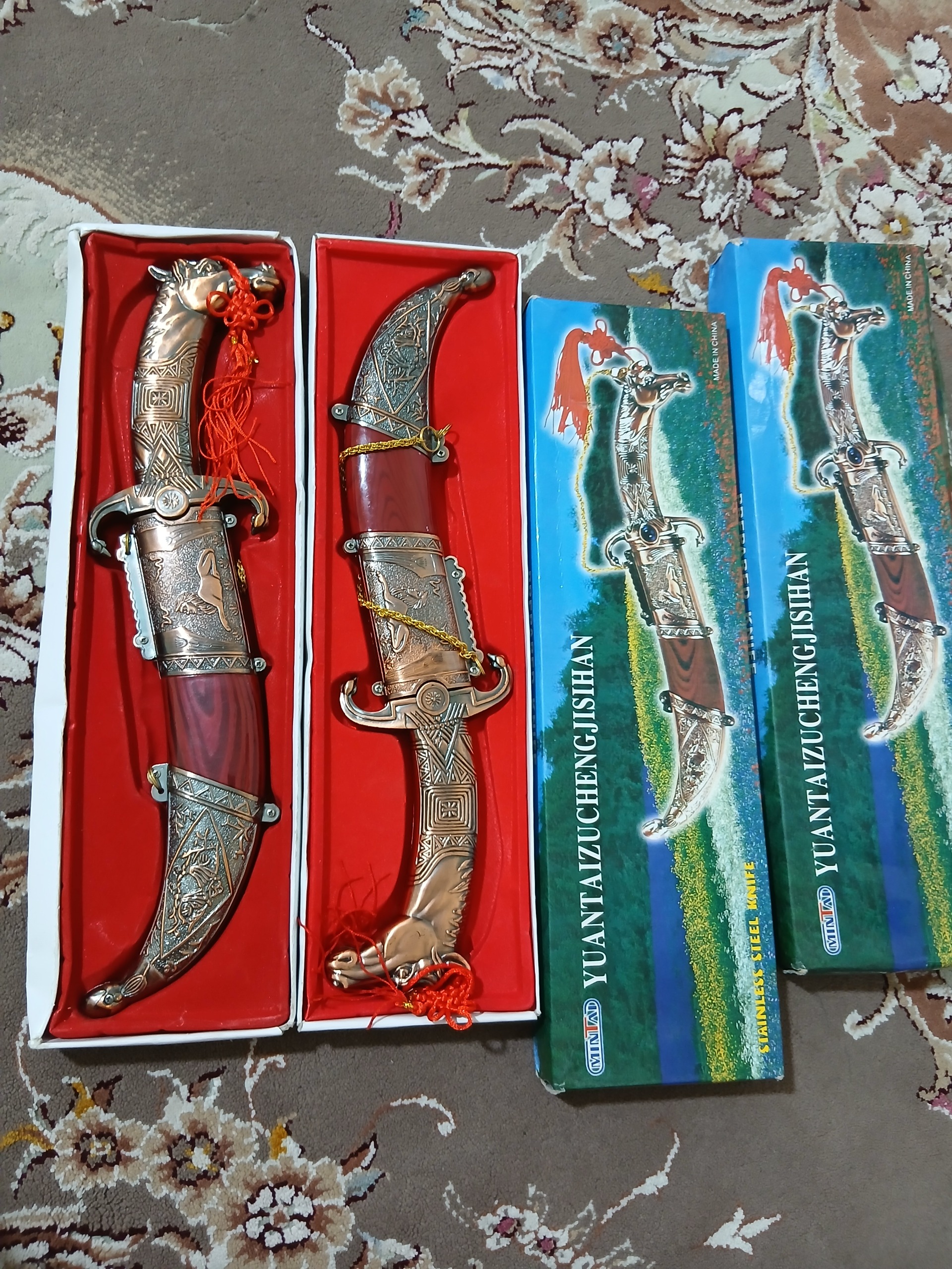 دو عدد چاقو قدیمی سایز بزرگ تزیینی نو تیغه ها استیل و تیز هستن دسته و قابش پلاستیکی فشرده هستن نو هستن با جعبه قیمت برای یک عدد هست
