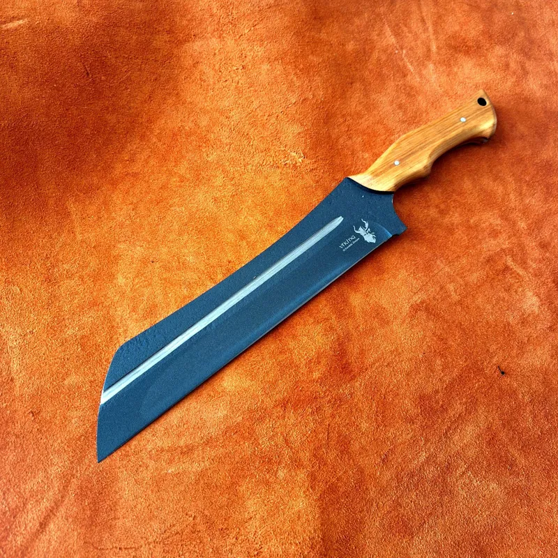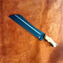 فلز تیغه بصورت یکپارچه تا انتهای دسته کشیده شده است و چوب دسته محکم و مقاوم روی فلز میخکوب شده است تیغه رنگ کوره خورده و ضدزنگ است