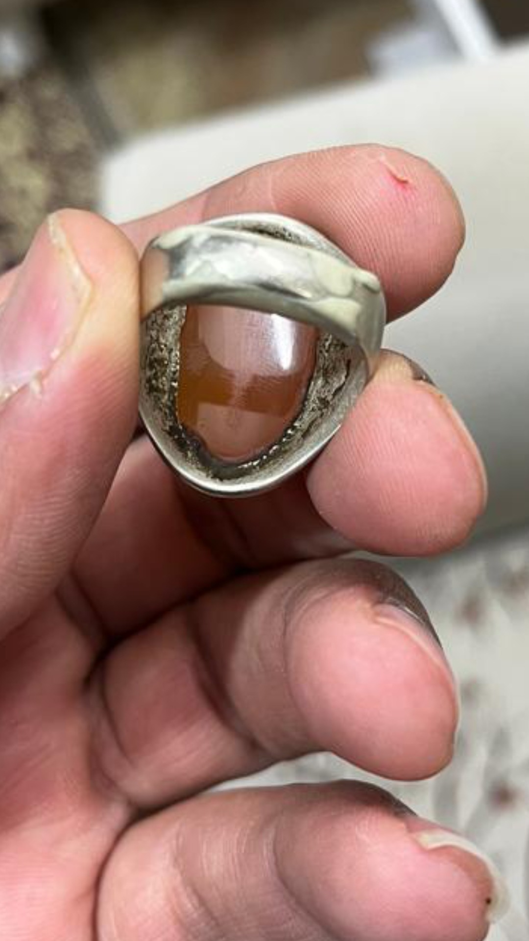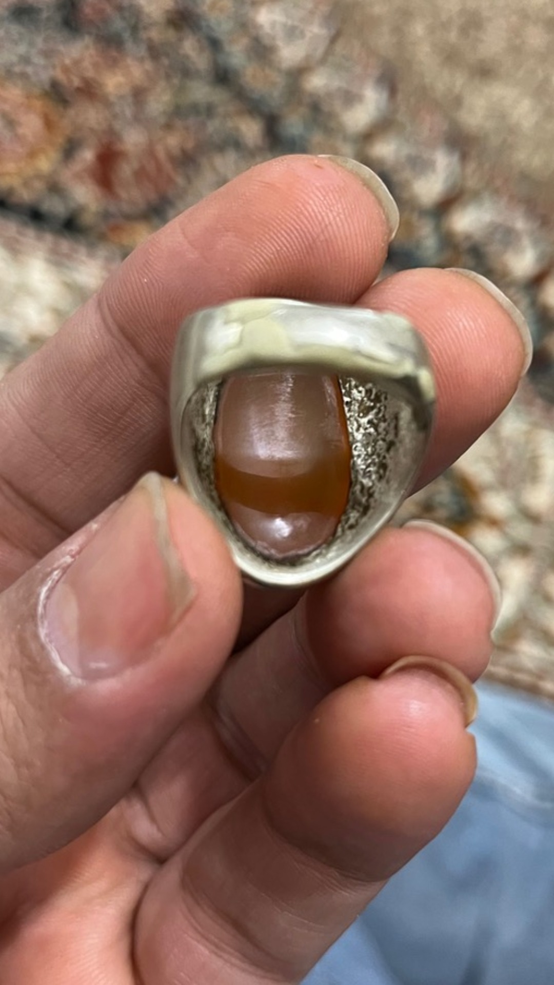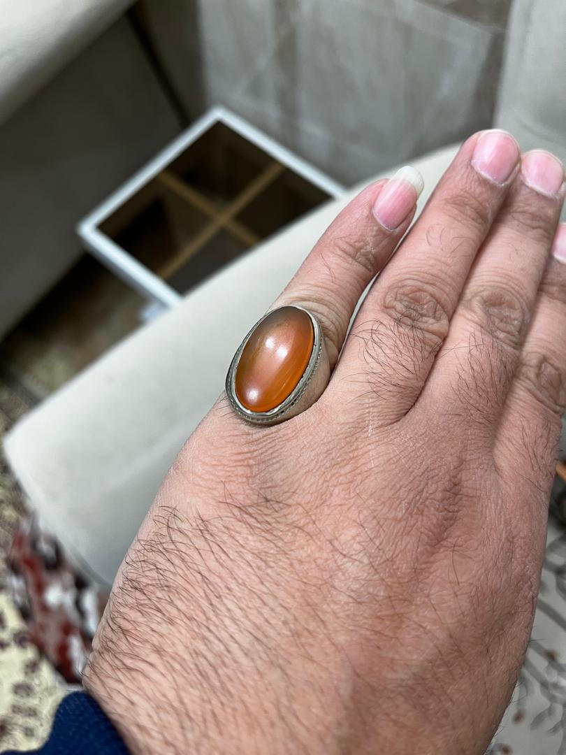 انگشتر عقیق تراشدار بسیار کهنه رکابش نقره قدیمه کم عیار هستش سنگش بزرگ نزدیک ب 3ثانت هستش خال سفید رگه خونی بااصالت توعکس معلومه