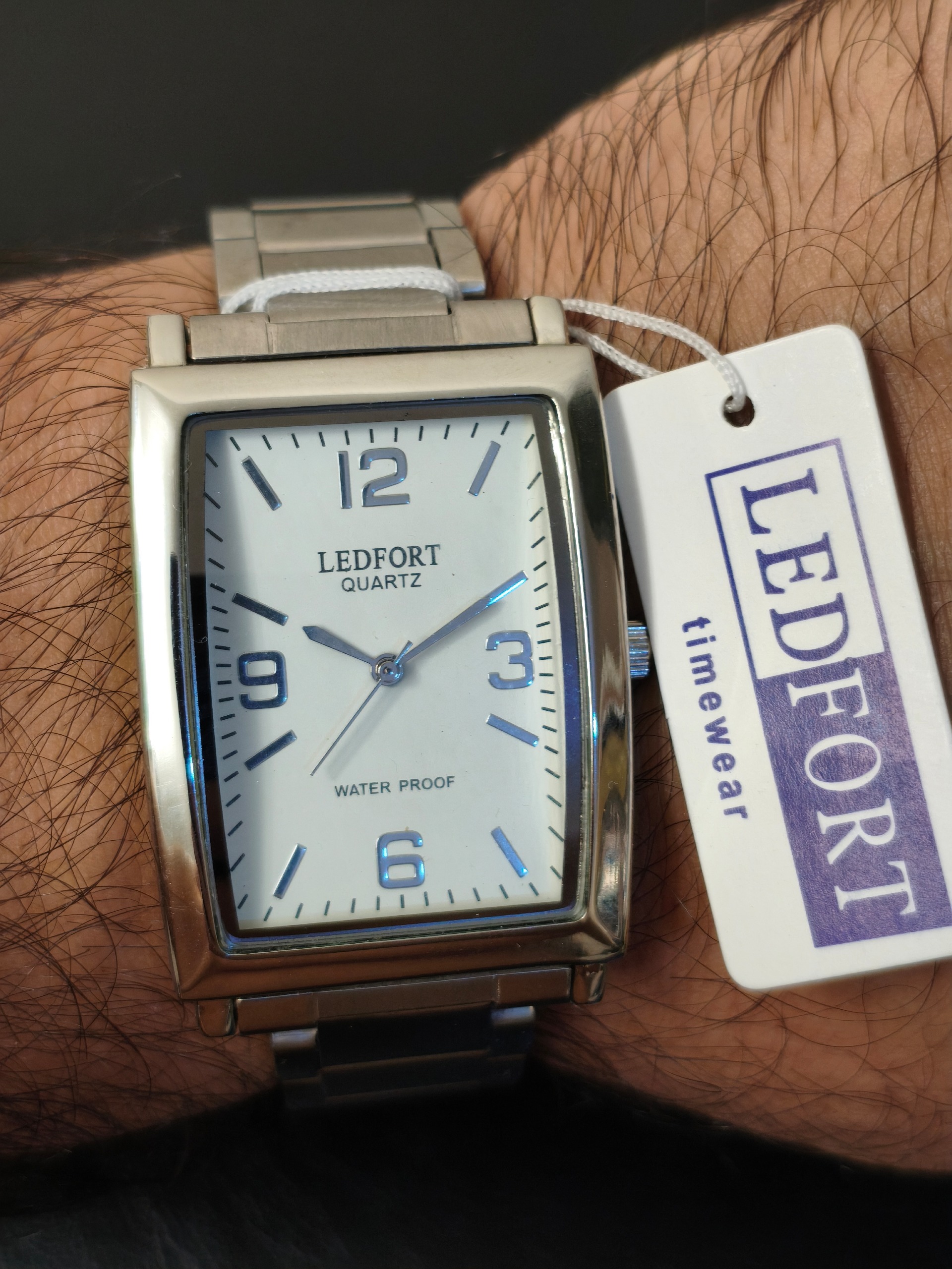 ساعتی شیک و خوشساخت از برند **LEDFORT timewear** با طراحی خاص قاب مستطیلی و صفحه سفید کلاسیک. ترکیب اعداد بزرگ برجسته و نشانگرهای مینیمال حس سادگی و اصالت را منتقل میکند. بدنه و بند هر دو از استیل باکیفیت ساخته شدهاند و حس استحکام و وقار را روی مچ دست ایجاد میکنند.